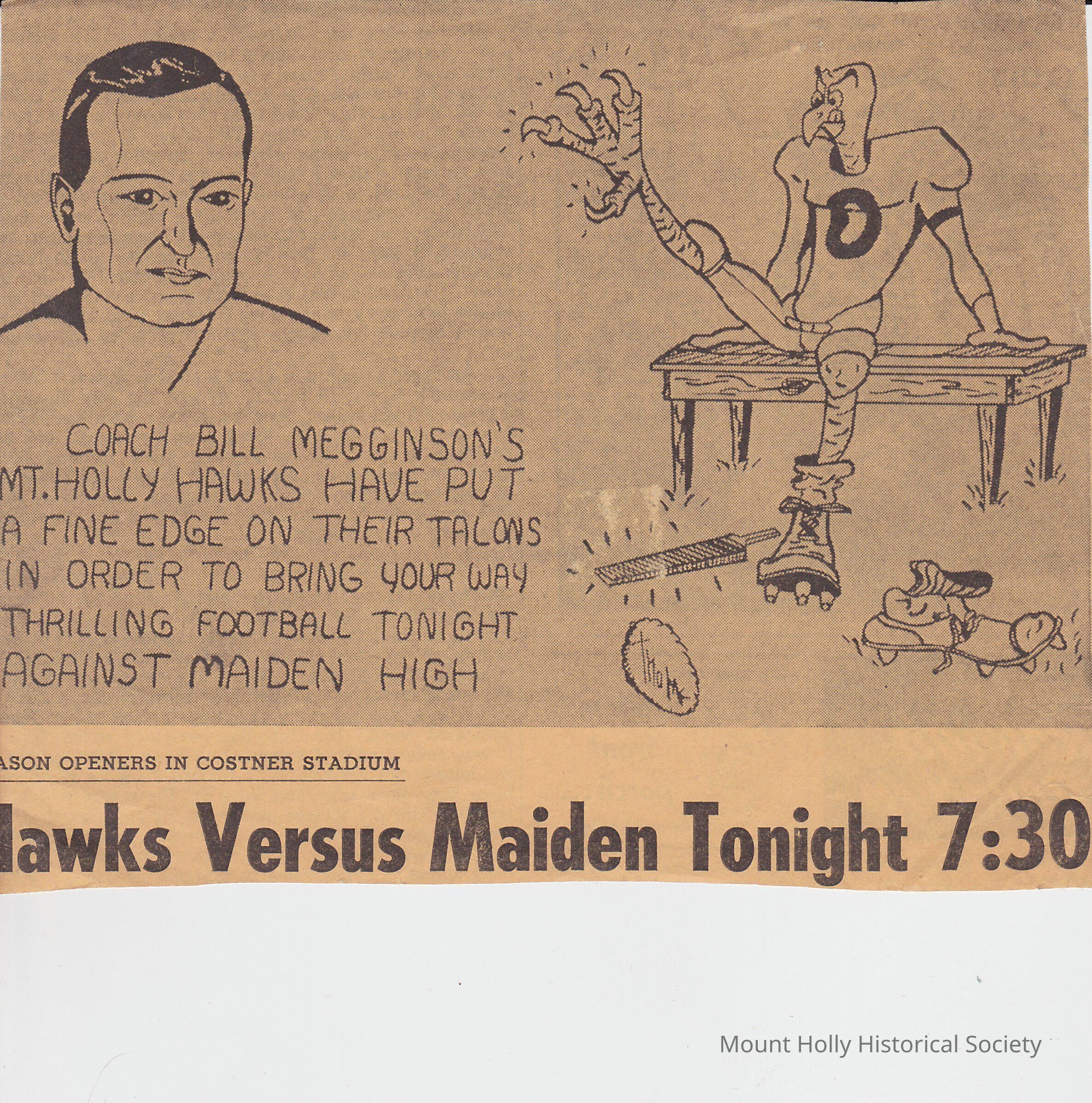 Newspaper Clipping - Mount Holly School, hand drawn football advertisement, Coach Bill Megginson