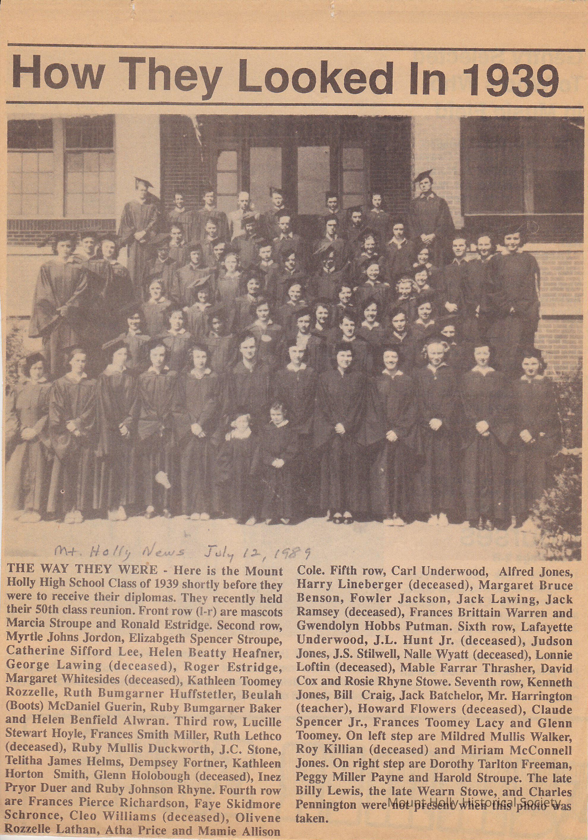 Mount Holly News Clipping - Solve a Mystery / Nostalgia Corner, Mount Holly High School - c/o 1939 and includes reunion picture (2)