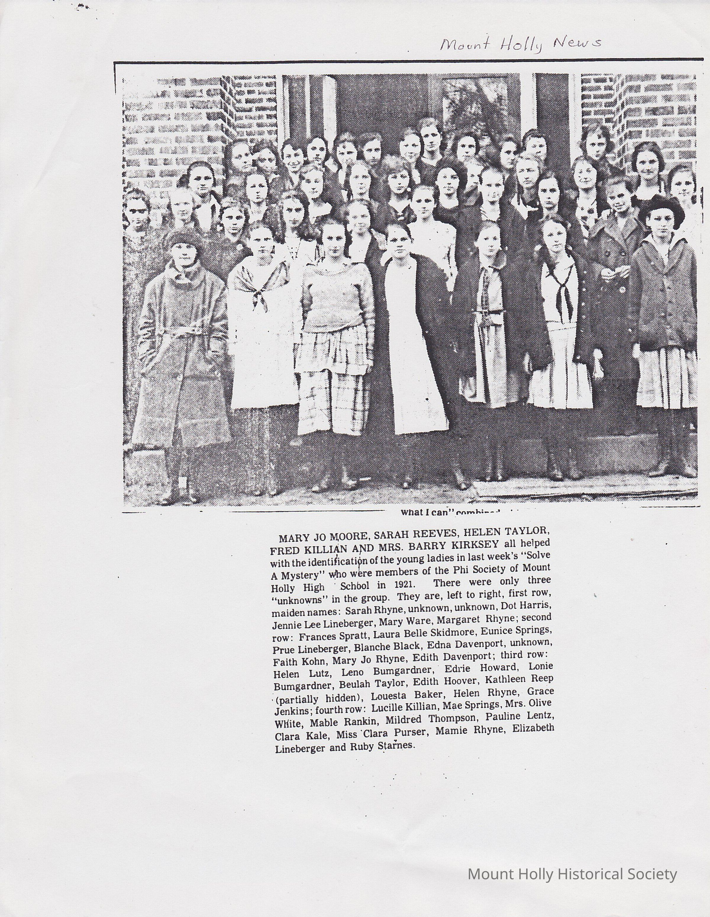 Mount Holly News Clipping - Solve a Mystery / Nostalgia Corner, Mount Holly High School 1921 - Phi Society