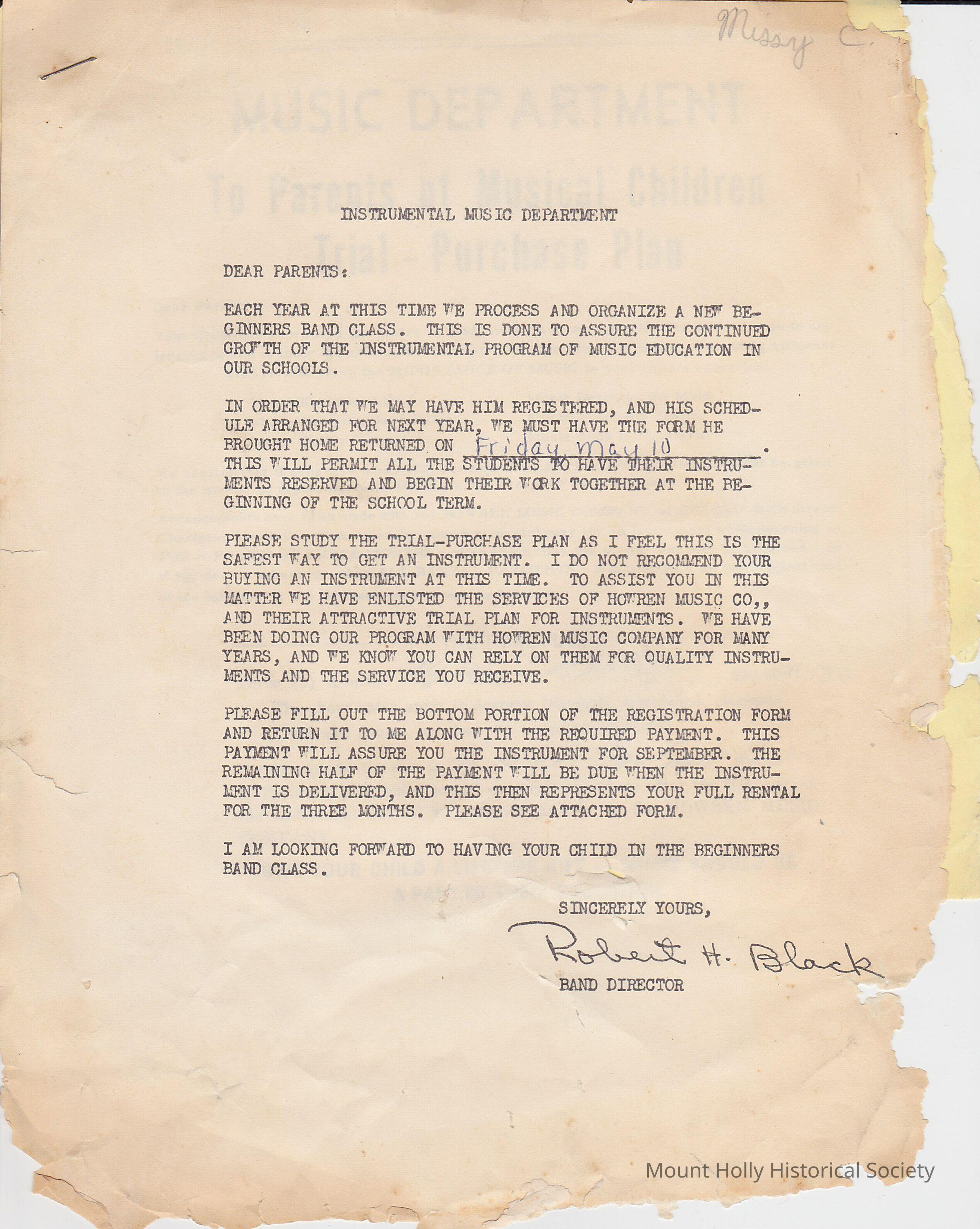 Mount Holly High School - Beginning Band Letter - Rober H Black