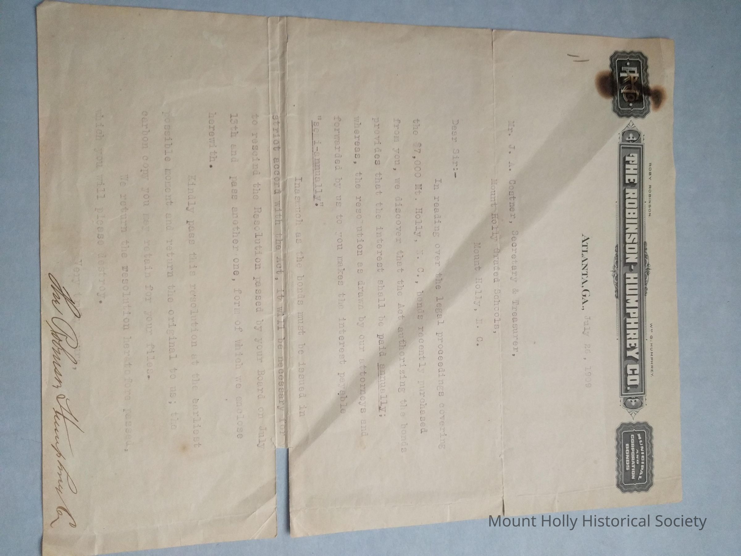 Letter from Robinson - Humphrey Co. to JA Costner with Mount Holly Graded Schools regarding school bond