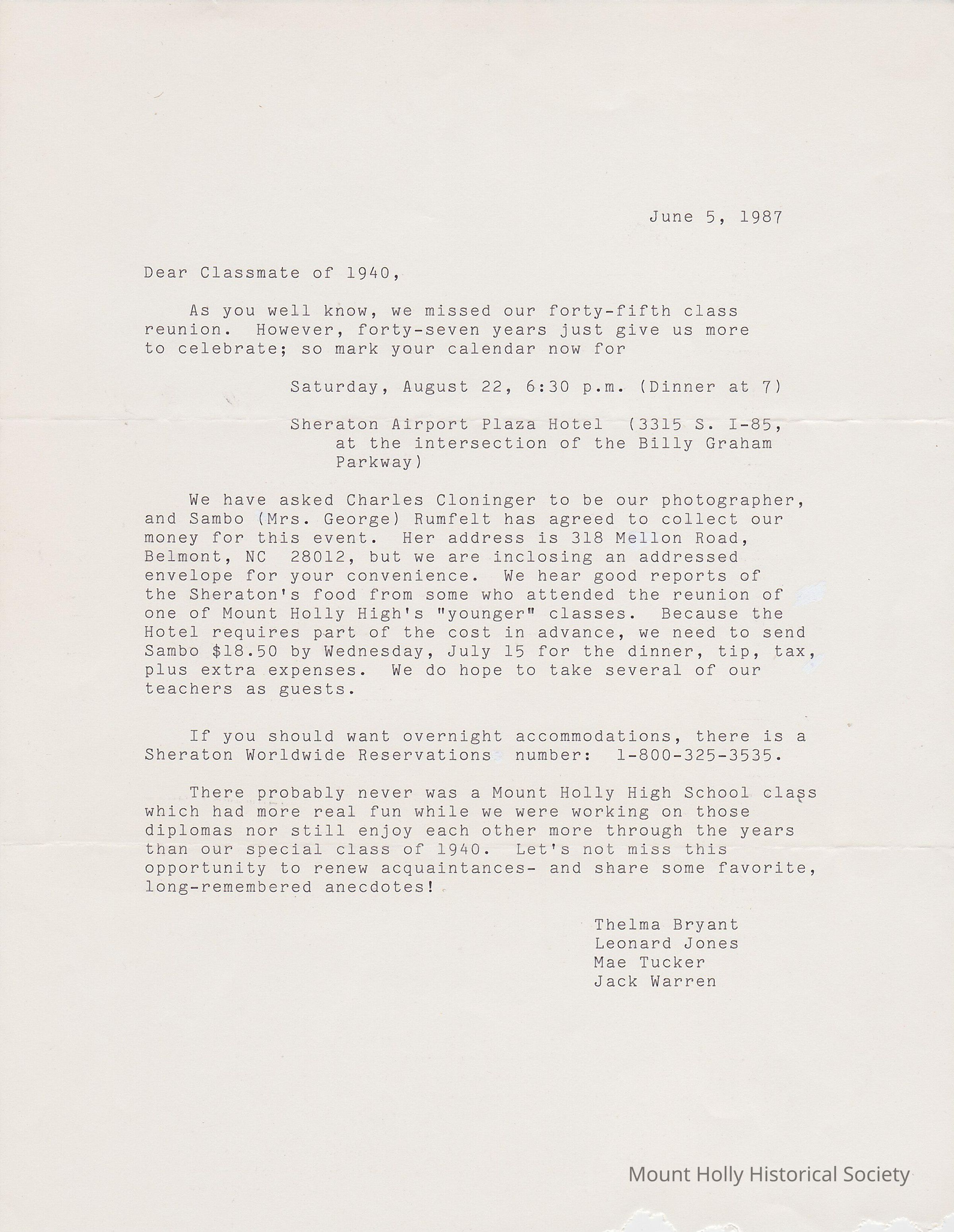 Mount Holly High School - c/o 1940 Reunion Invitation and letter from Mae Tucker