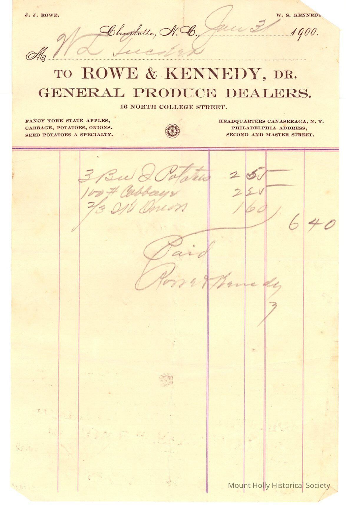 Receipt from Rowe & Kennedy to W.L. Tucker for purchase of potatoes, cabbage, and onions