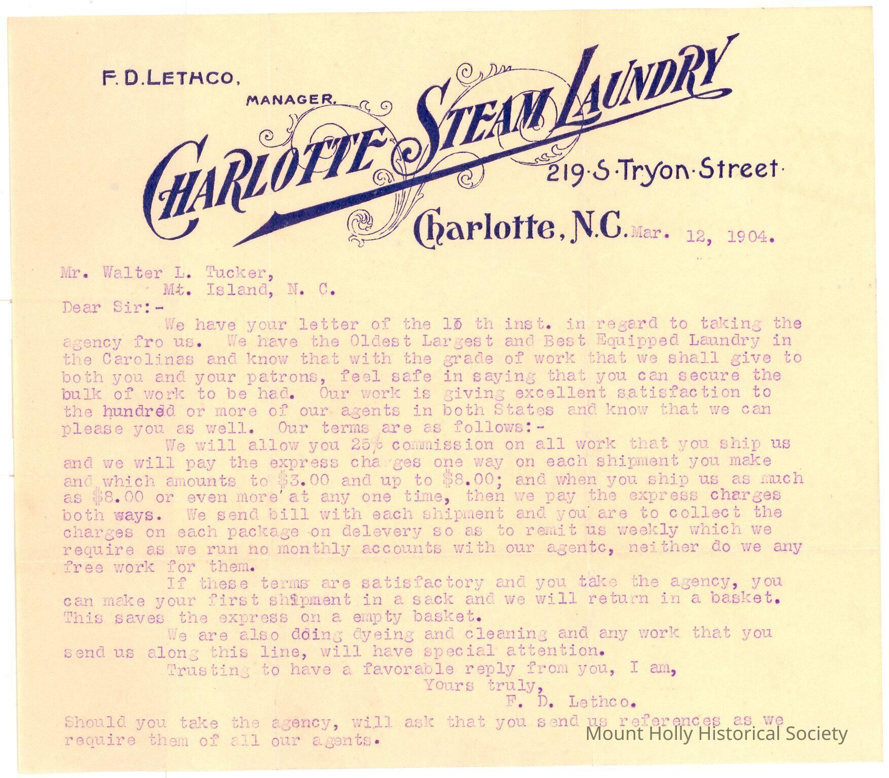 Letter (with envelope) from F.D. Lethco of Charlotte Steam Laundry to W.L. Tucker, offering for the latter to become an agent for CSL