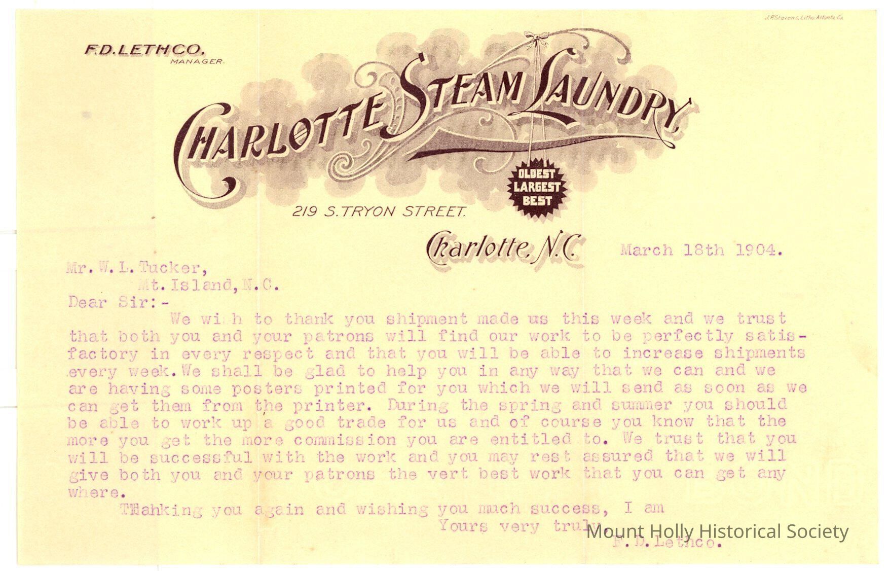 Letter (with envelope) from F.D. Lethco to W.L. Tucker, thanking him for sending laundry and saying he would send him some posters