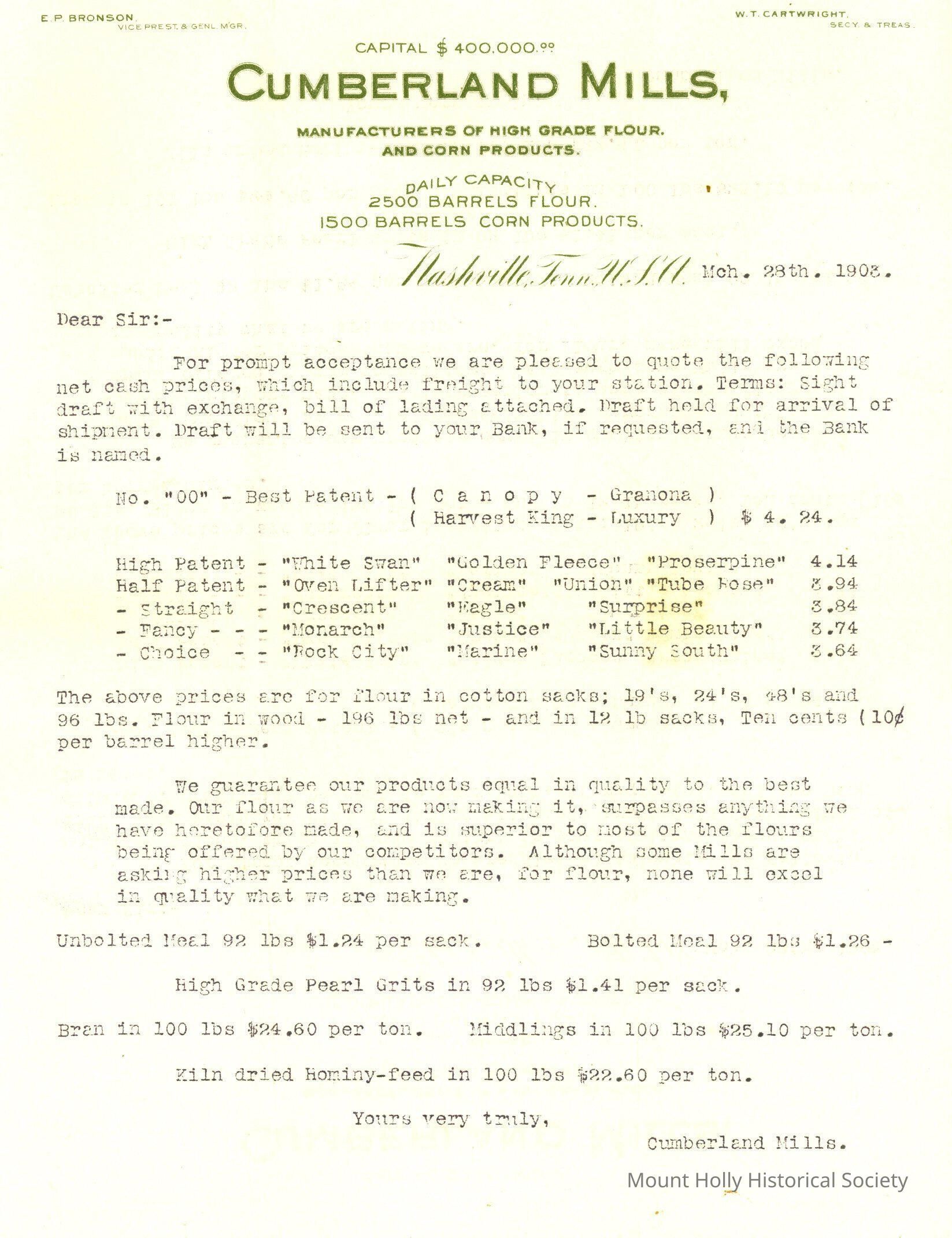 Letter (with envelope) from Cumberland Mills (Tenn.) to W.L. Tucker, describing types and prices of flour they offered