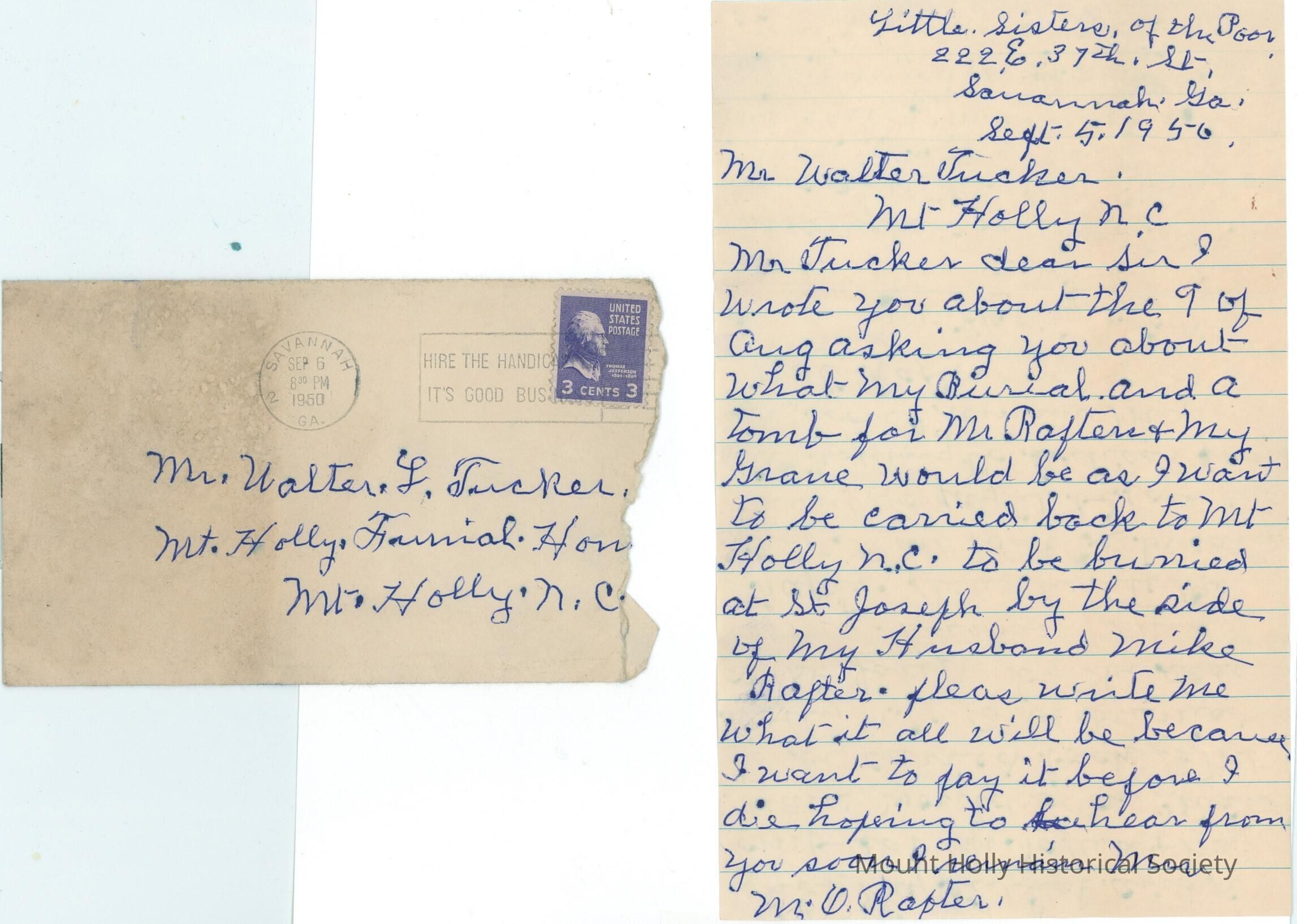 Second letter (with envelope) from Mrs. M.O. Rafter to W.L. Tucker inquiring about price of burial beside her husband