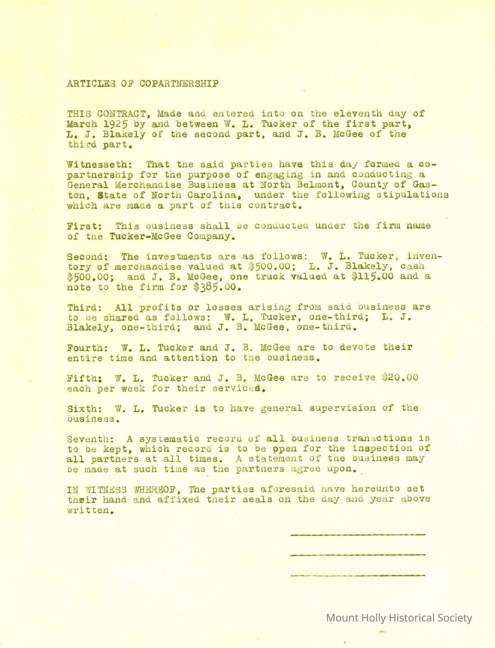 Unsigned contract in triplicate among W.L. Tucker, L.J. Blakely, and J.B. McGee to establish partnership and create general store in North Belmont (articles of copartnership)