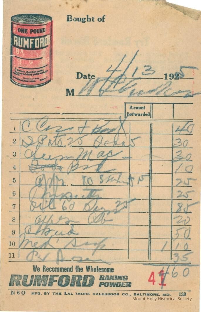 Receipt to W.L. Tucker for groceries, with recipes for baking using Rumford powder on back