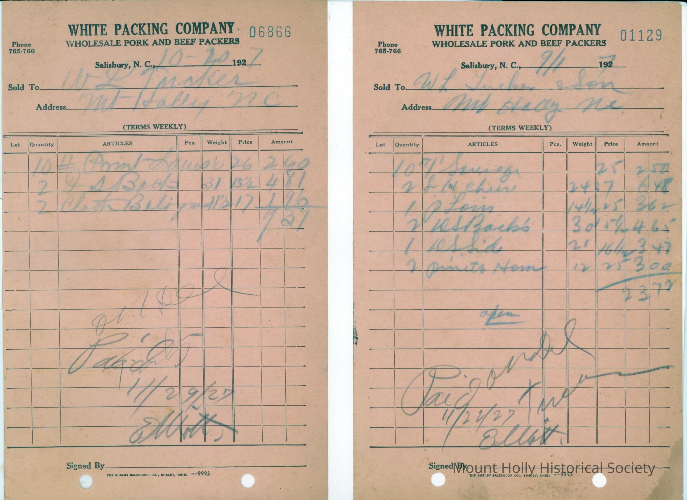 Numerous receipts from White Packing Co. in Salisbury to Walter Tucker & Son for beef and pork (only two scanned)
