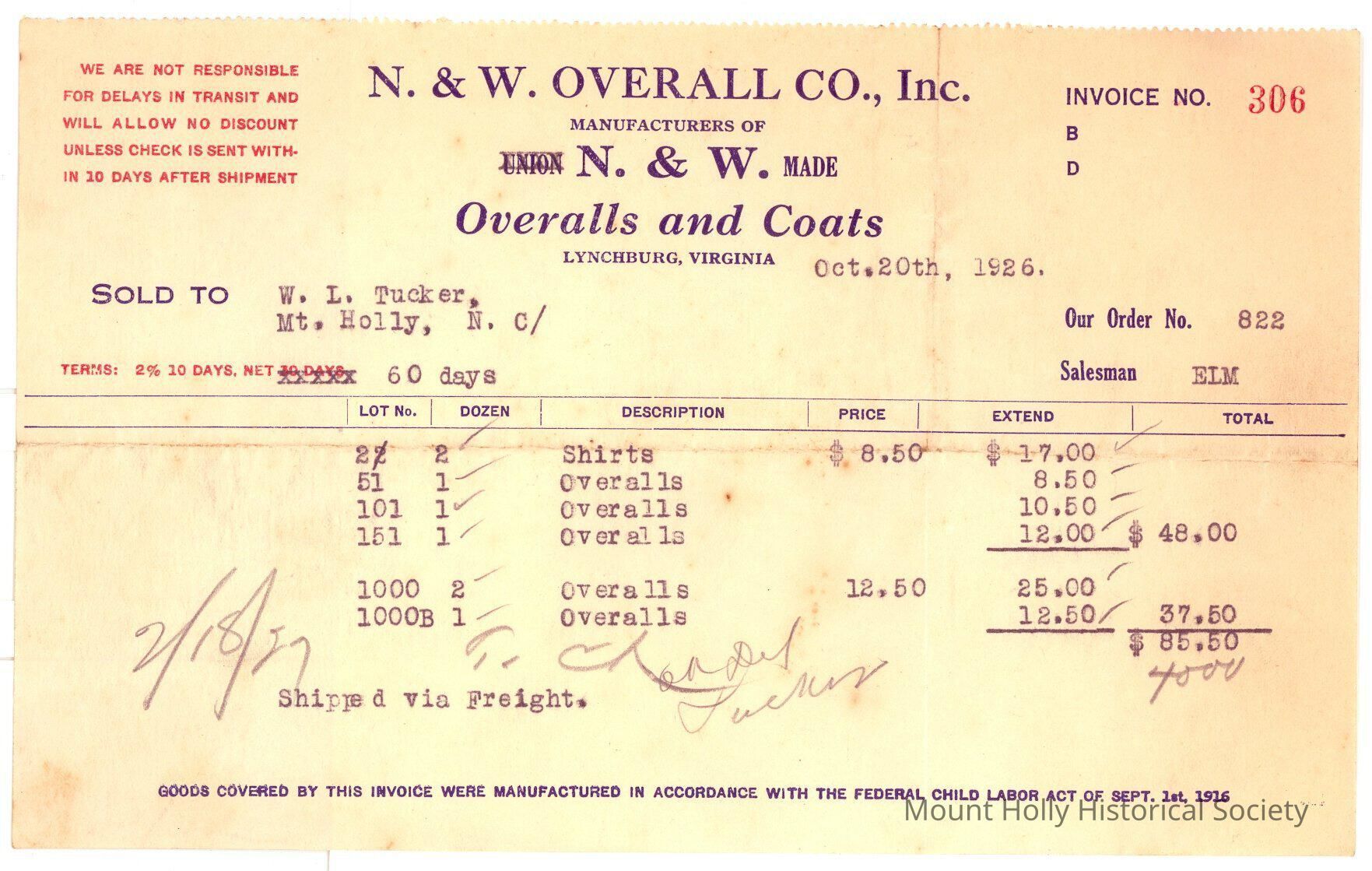 Invoice from N & W Overall Co. to W.L. Tucker for shirts and overalls (connected to 2012.40.45)