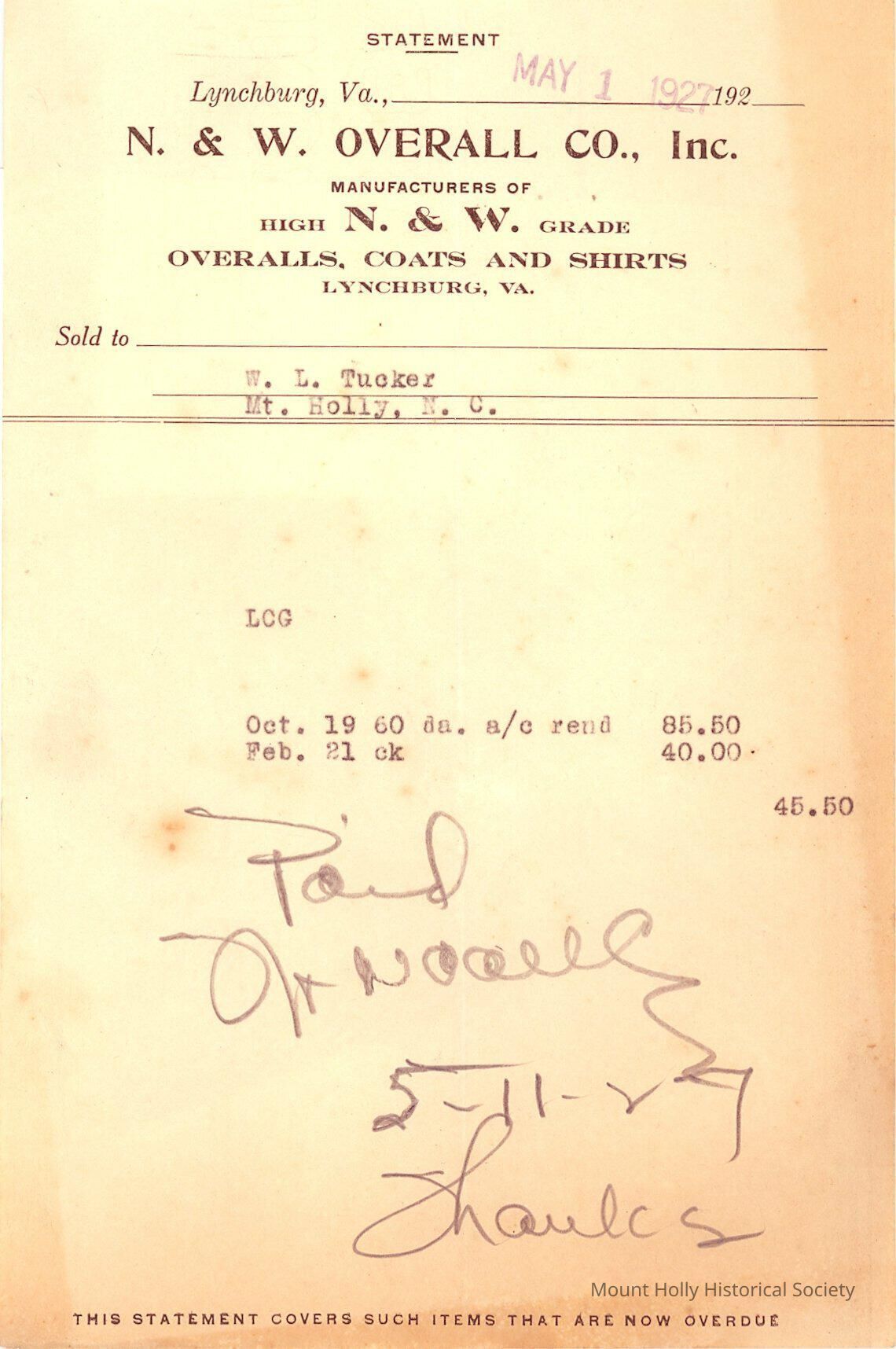 Statement of N & W Overall Co. to W.L. Tucker for payment of order of Oct. 20, 1926 (see 2012.40.46)