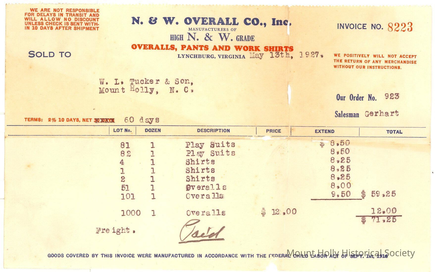 Invoice from N & W Overall Co. to W.L. Tucker for a new order of play suits, shirts, and overalls