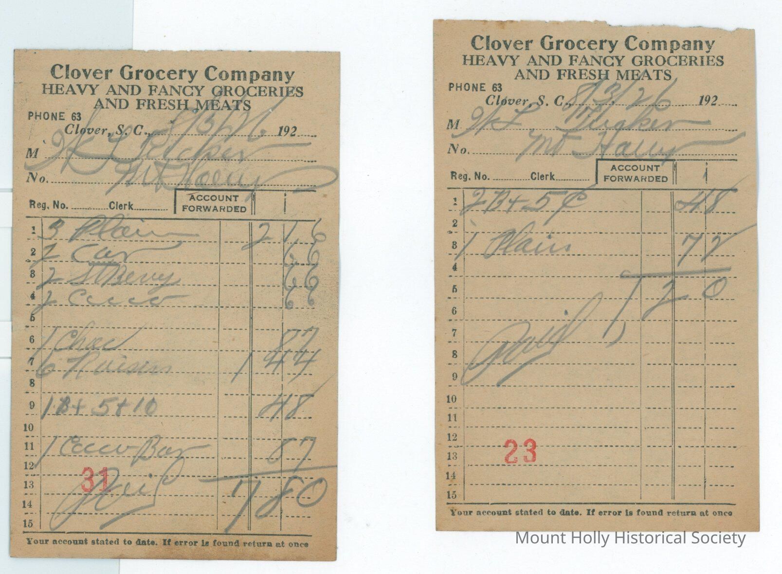 Several receipts (only two scanned) from Clover Grocery Co. in Clover (SC) to W.L. Tucker for groceries