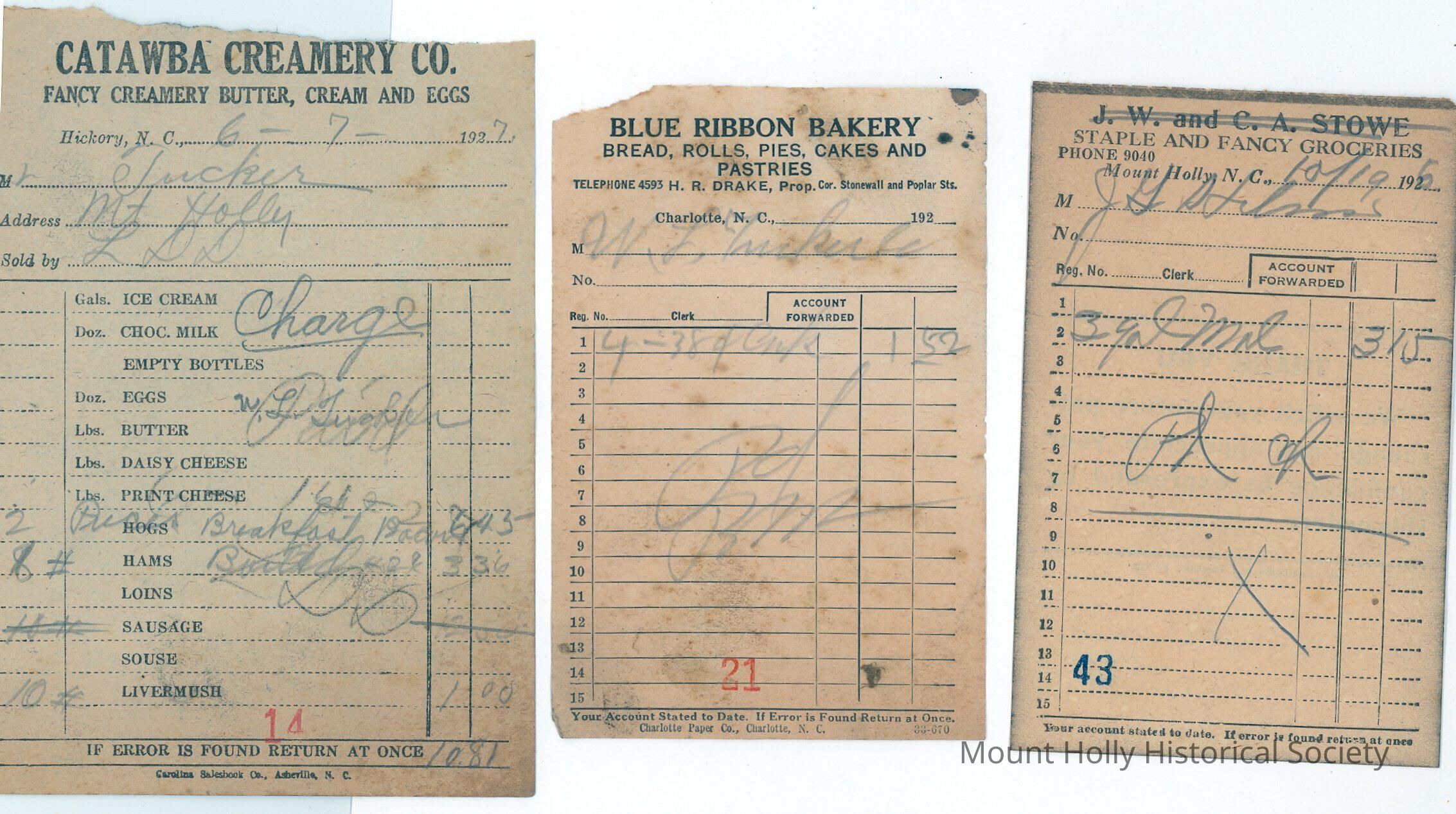 Several invoices from Catawba Creamery Co. (Hickory), Blue Ribbon Bakery (Charlotte), and J.W. & C.A. Stowe (Mt. Holly) to W.L. Tucker