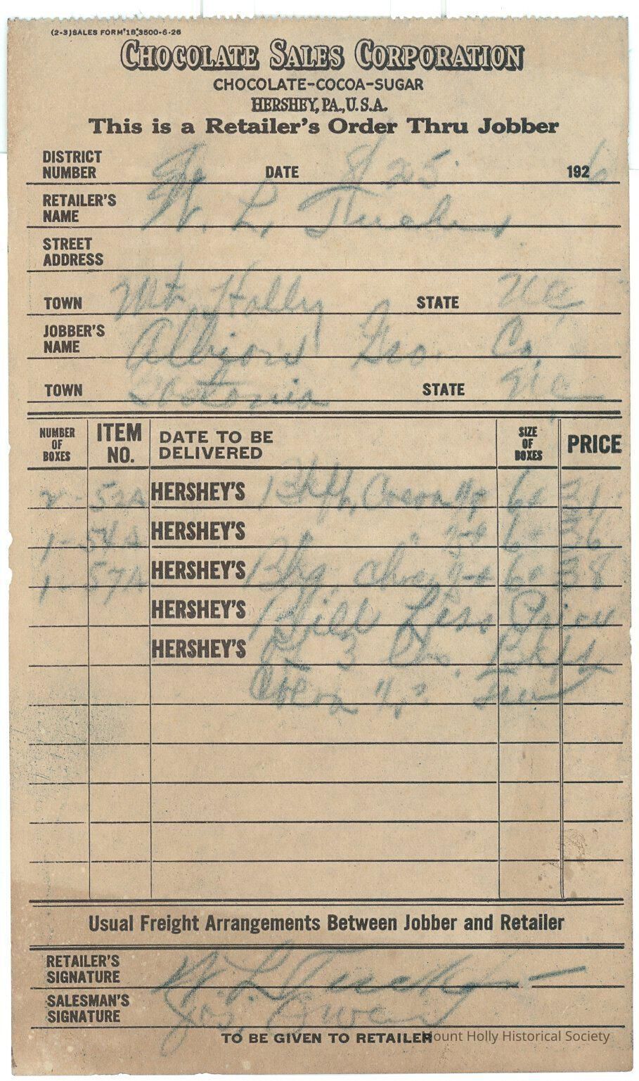 Retailer's order from Chocolate Sales Corp. in Hershey (PA) to W.L. Tucker for candy