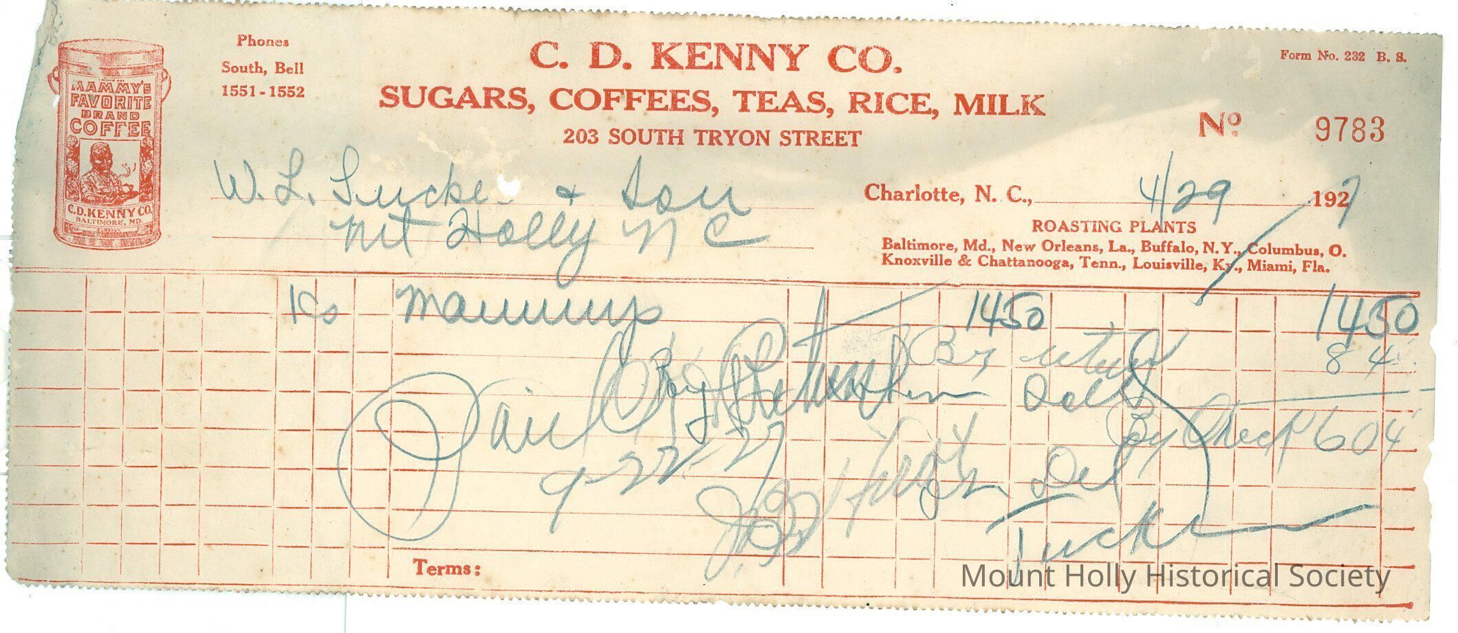 Invoice from C.D. Kenny Co. in Charlotte to W.L. Tucker for groceries
