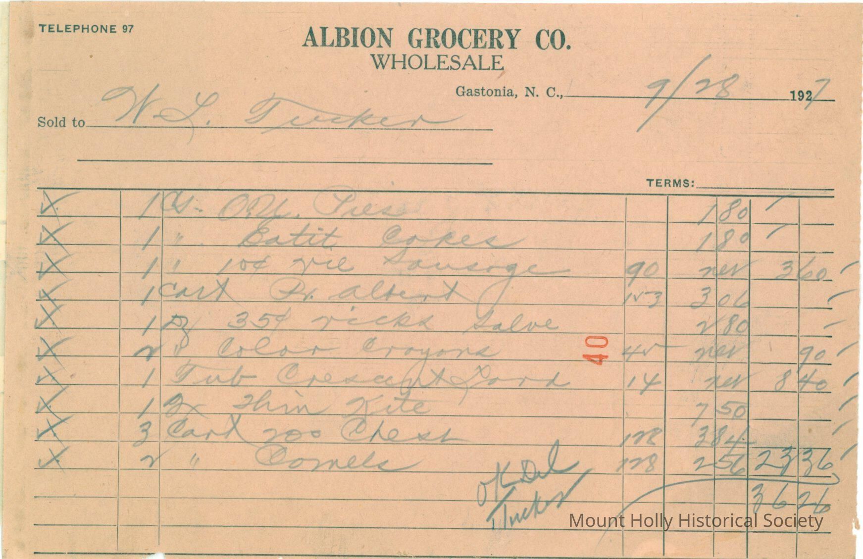 Multiple invoices (only one scanned) from Albion Grocery Co. to W.L. Tucker for goods