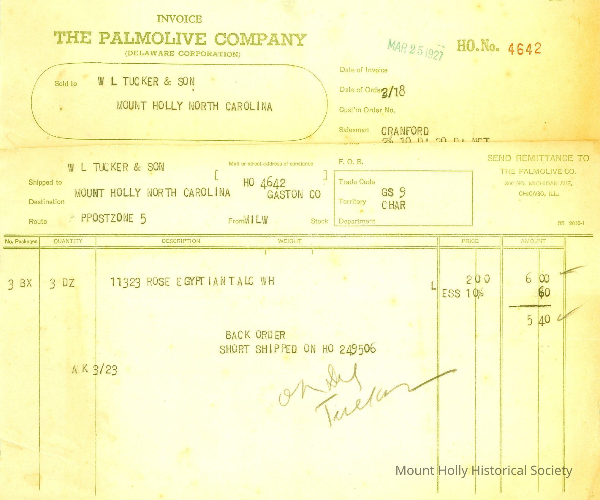 Three invoices (only one scanned) from Palmolive Co. in Chicago to W.L. Tucker for Egyptian talc (ordered on 2/18/27)