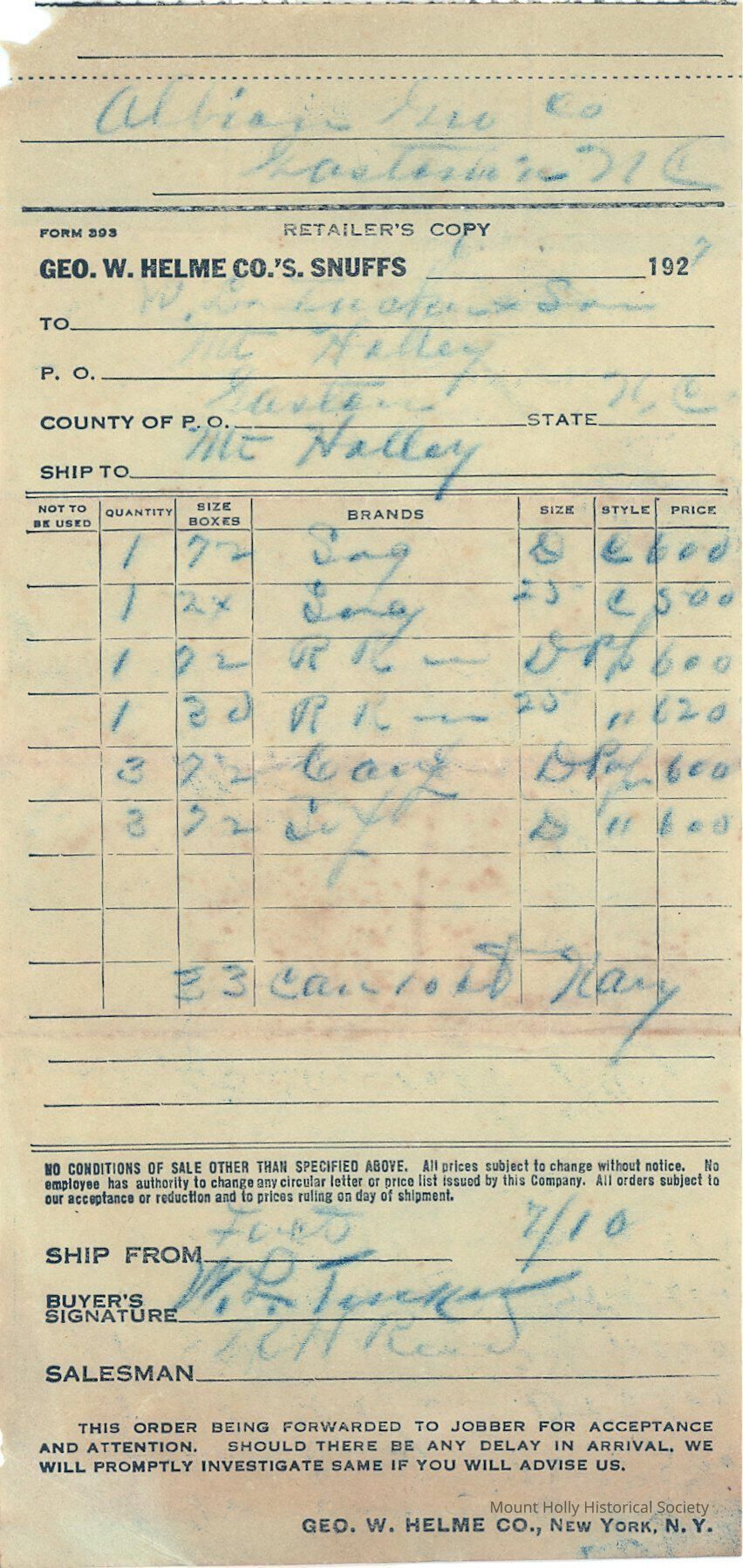 Invoice from George W. Helme Co. to W.L. Tucker for snuff