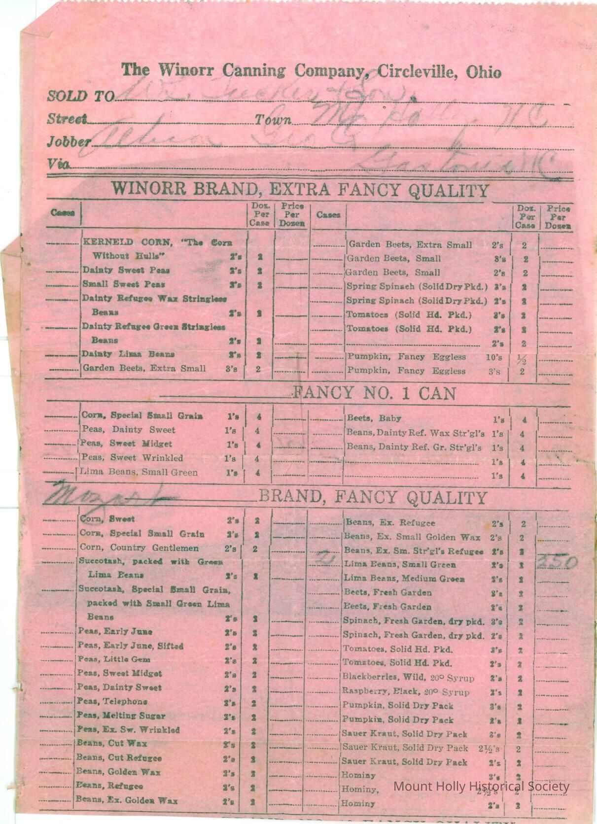 Invoice from Winorr Canning Co. in Circleville (OH) to W.L. Tucker for canned vegetables (list has been folded in half as it was too long for the scanner)