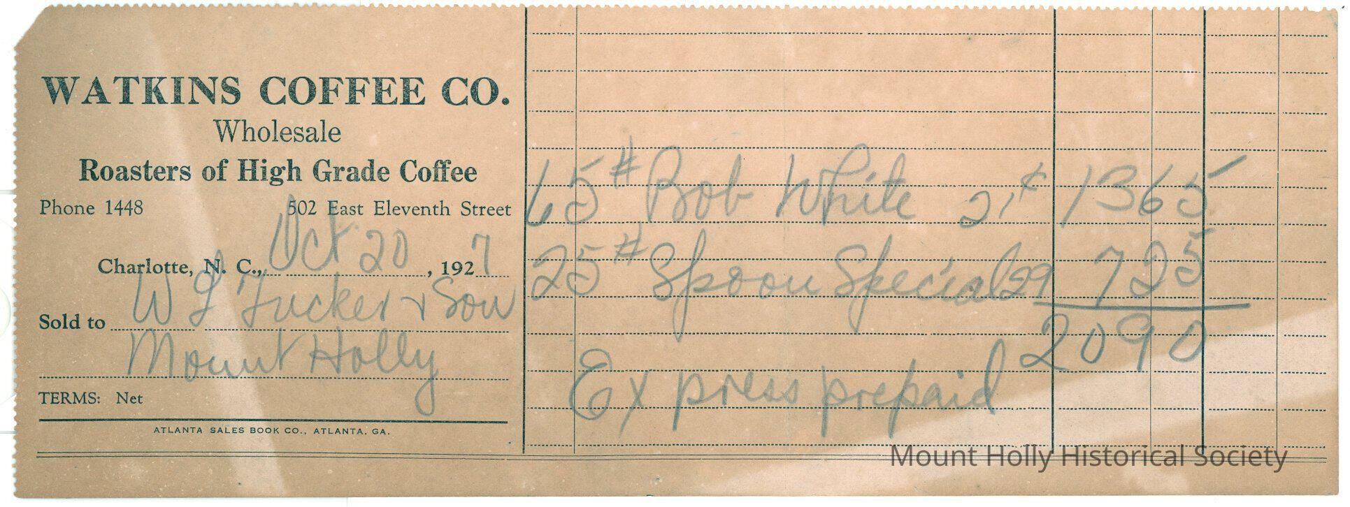 Invoice from Watkins Coffee Co. in Charlotte to W.L. Tucker for coffee