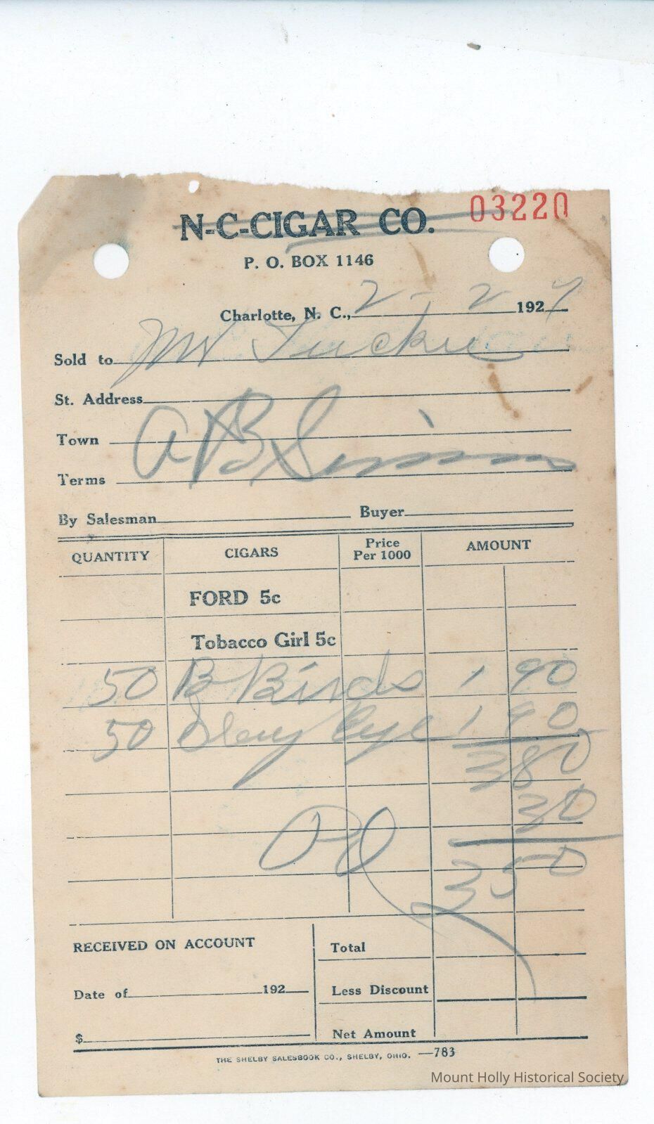 Invoice from NC Cigar Co. in Charlotte to W.L. Tucker for tobacco