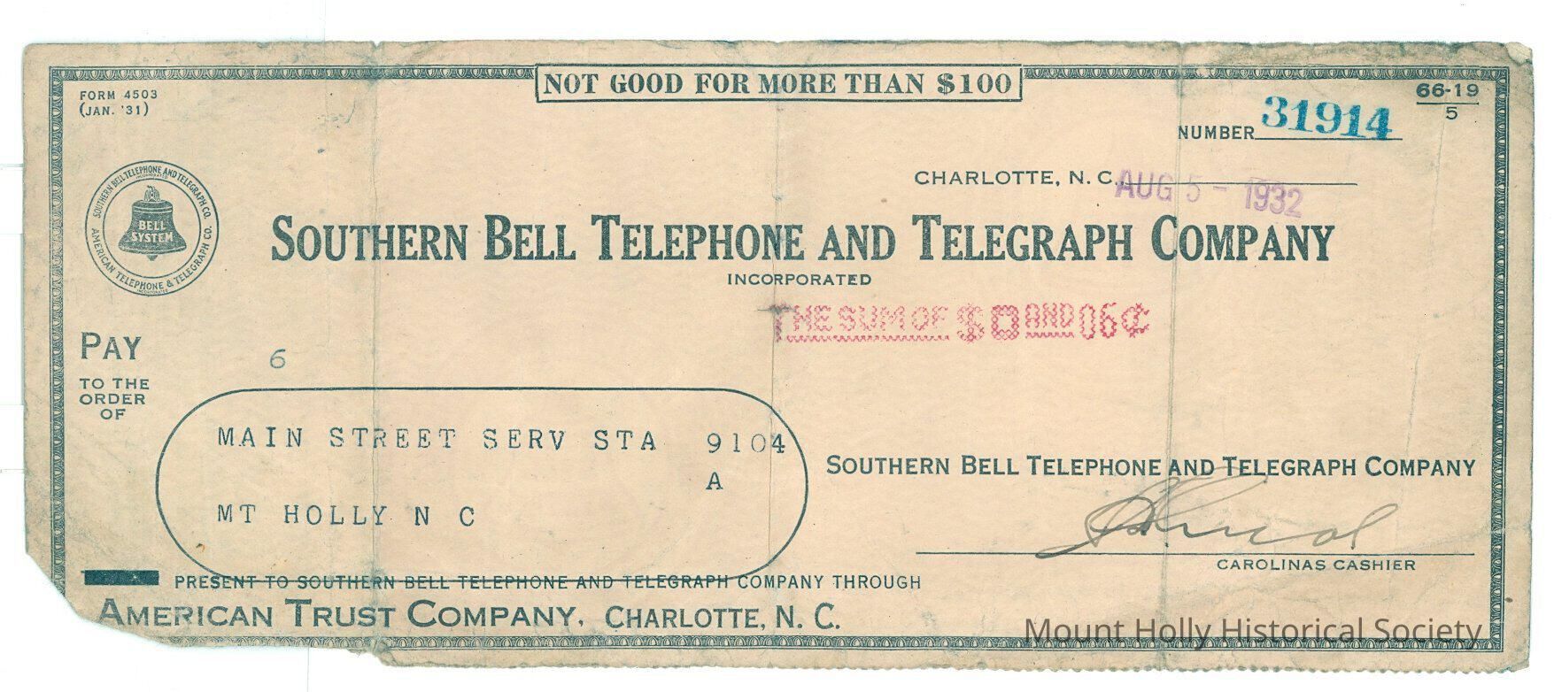 Check from Southern Bell to Main Street Service Station for six cents, endorsed by W.L. Tucker