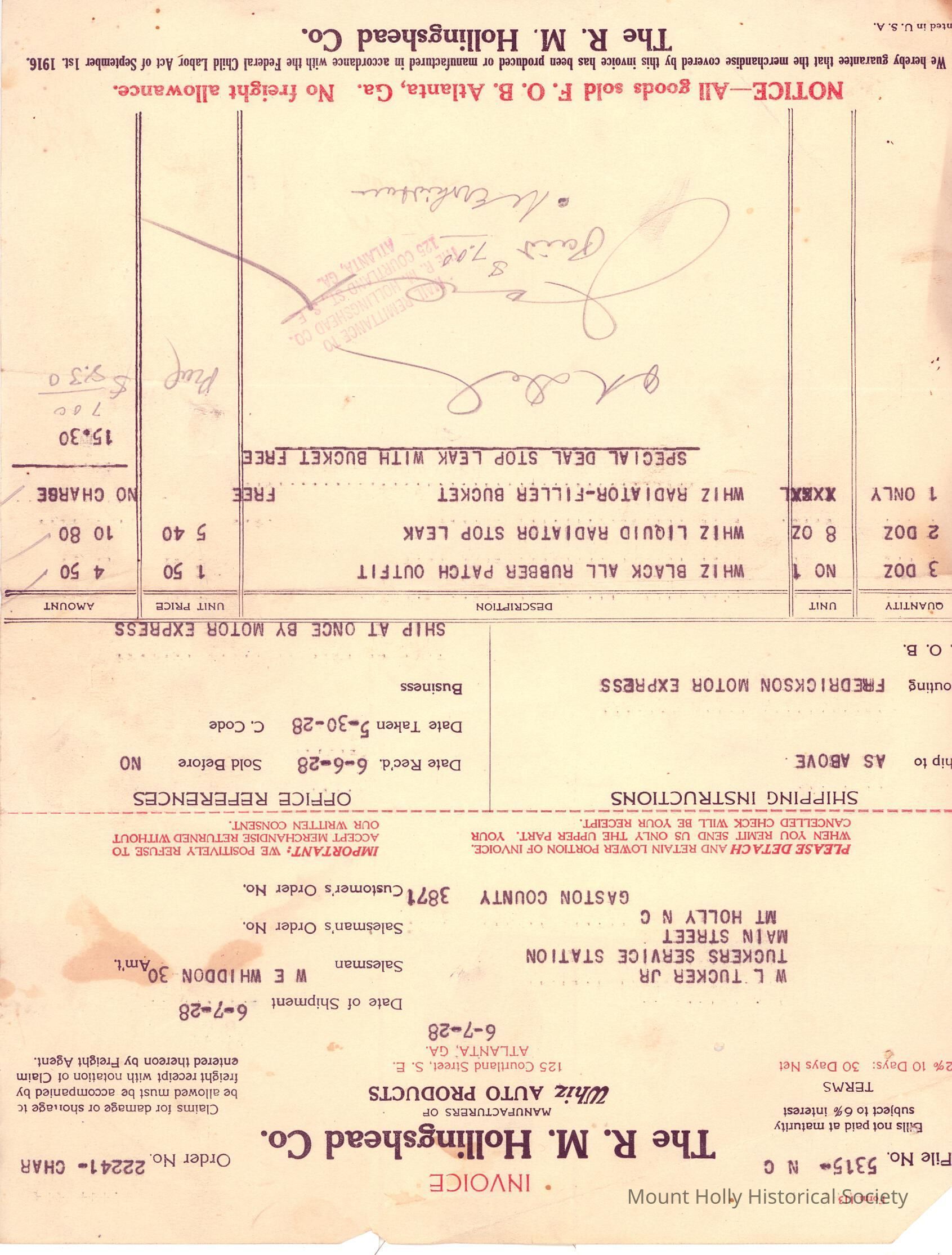 Invoice from the R.M. Hollinghead Co. in Atlanta to W.L. Tucker, Jr. for rubber patches and liquid radiator stop leak