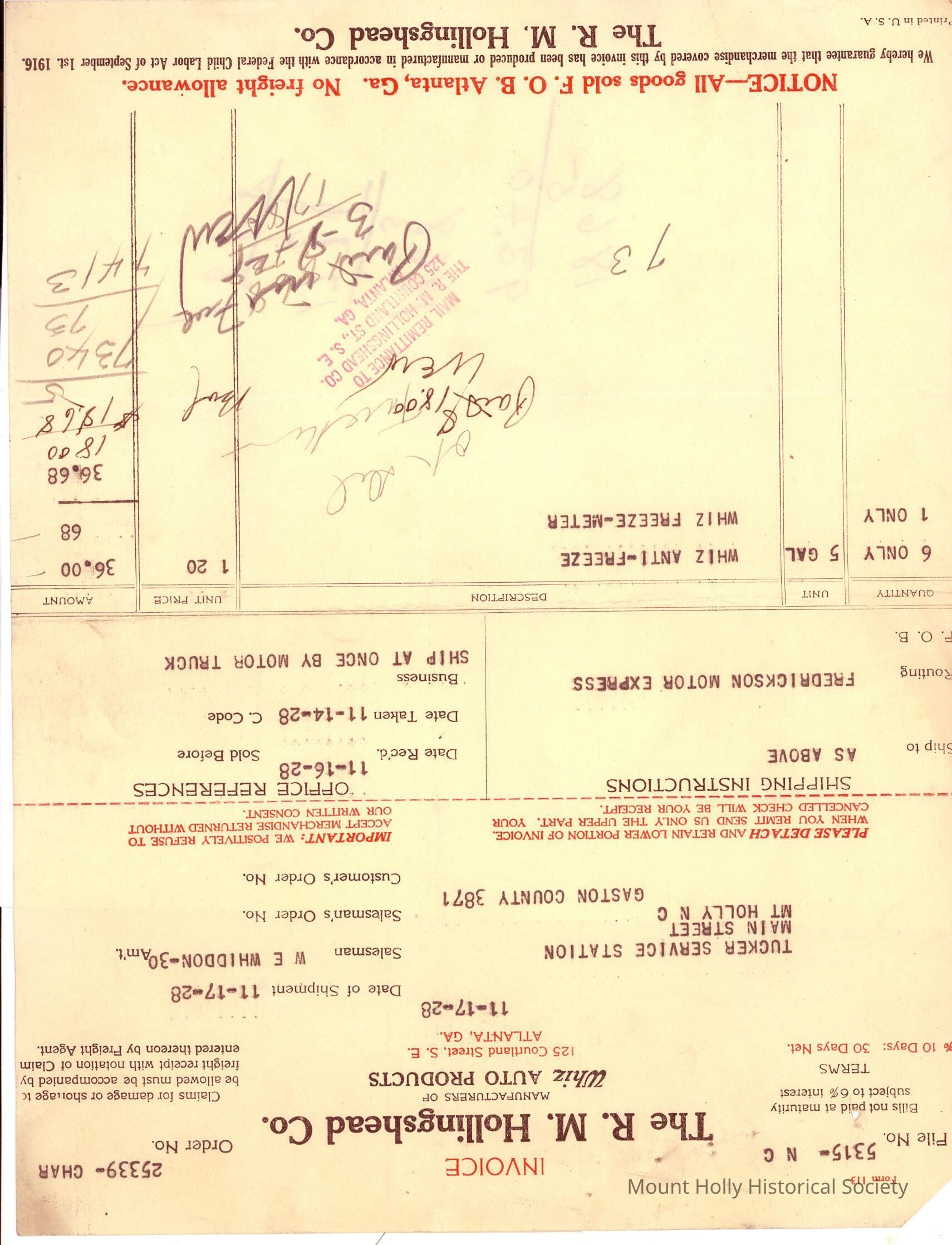 Invoice from the R.M. Hollinghead Co. in Atlanta to Tucker Service Station for antifreeze and meter
