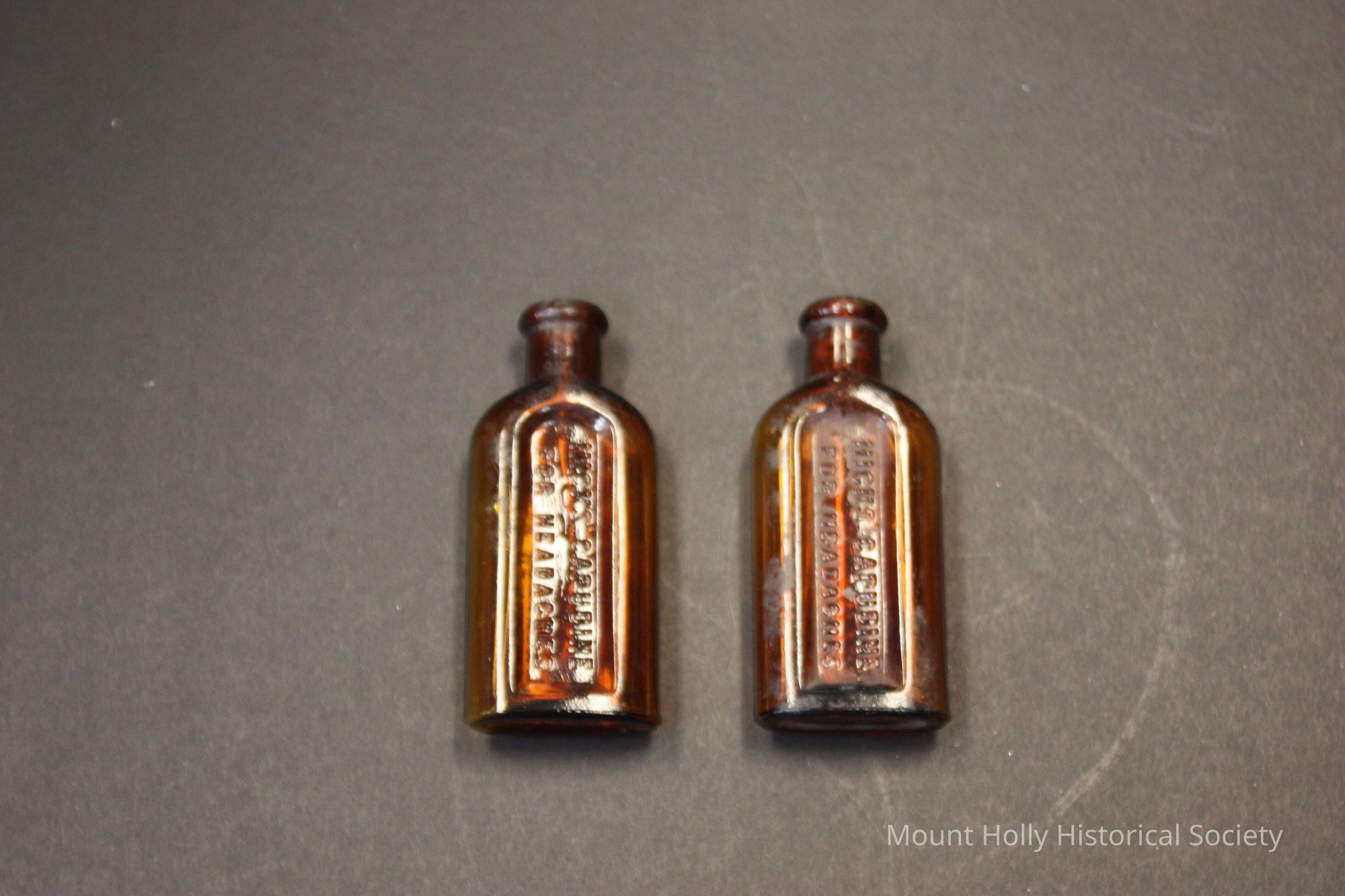 Five amber medicine bottles - three are round stopper bottles (without stopper) and 2 flat stopper bottles (without stopper) embossed with "Hicks' Capudine for Headache"