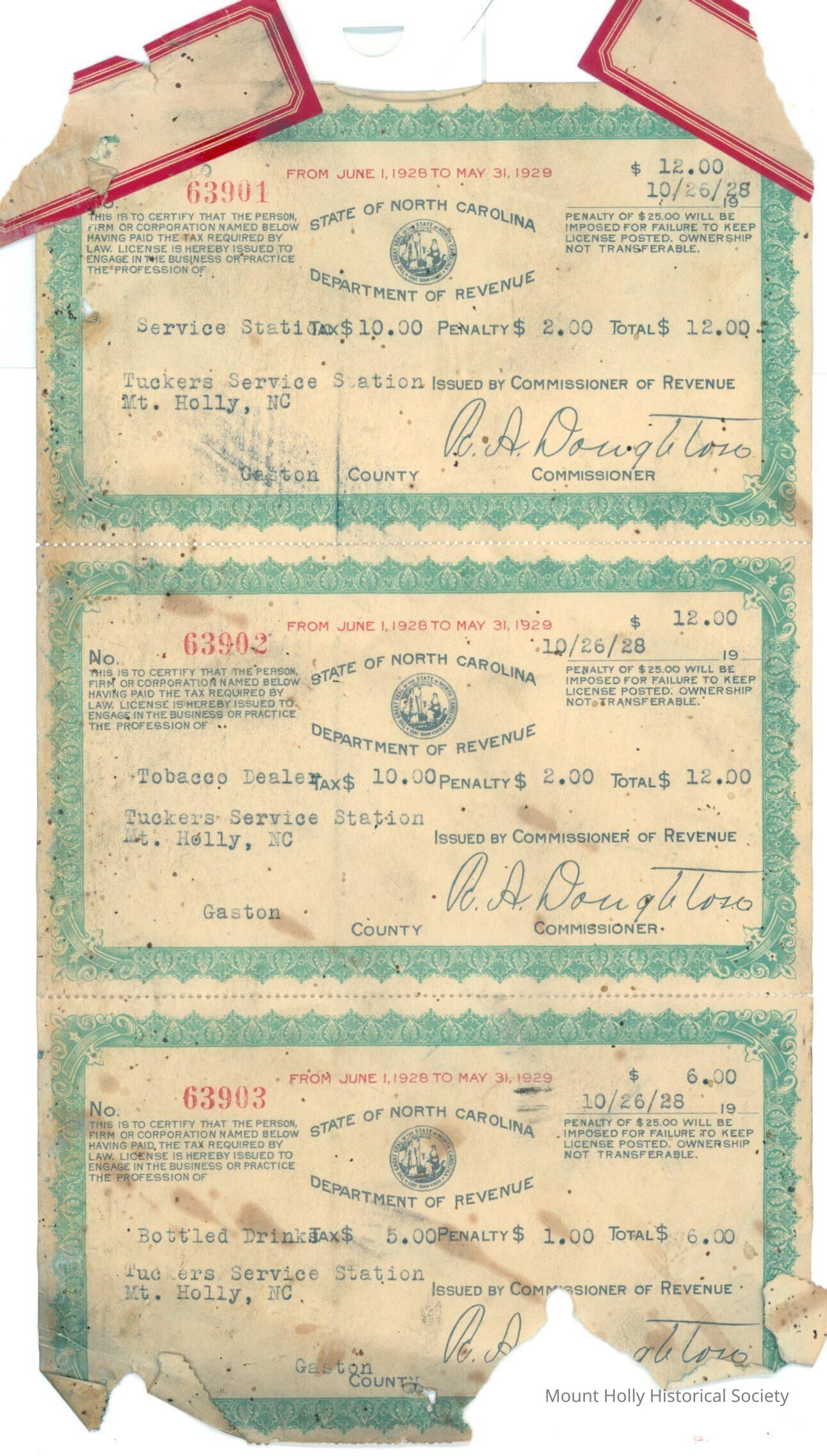 Three certificates from the state of NC to Tucker Service Station confirming payment of license taxes for operating a service station, selling tobacco, and selling bottled drinks