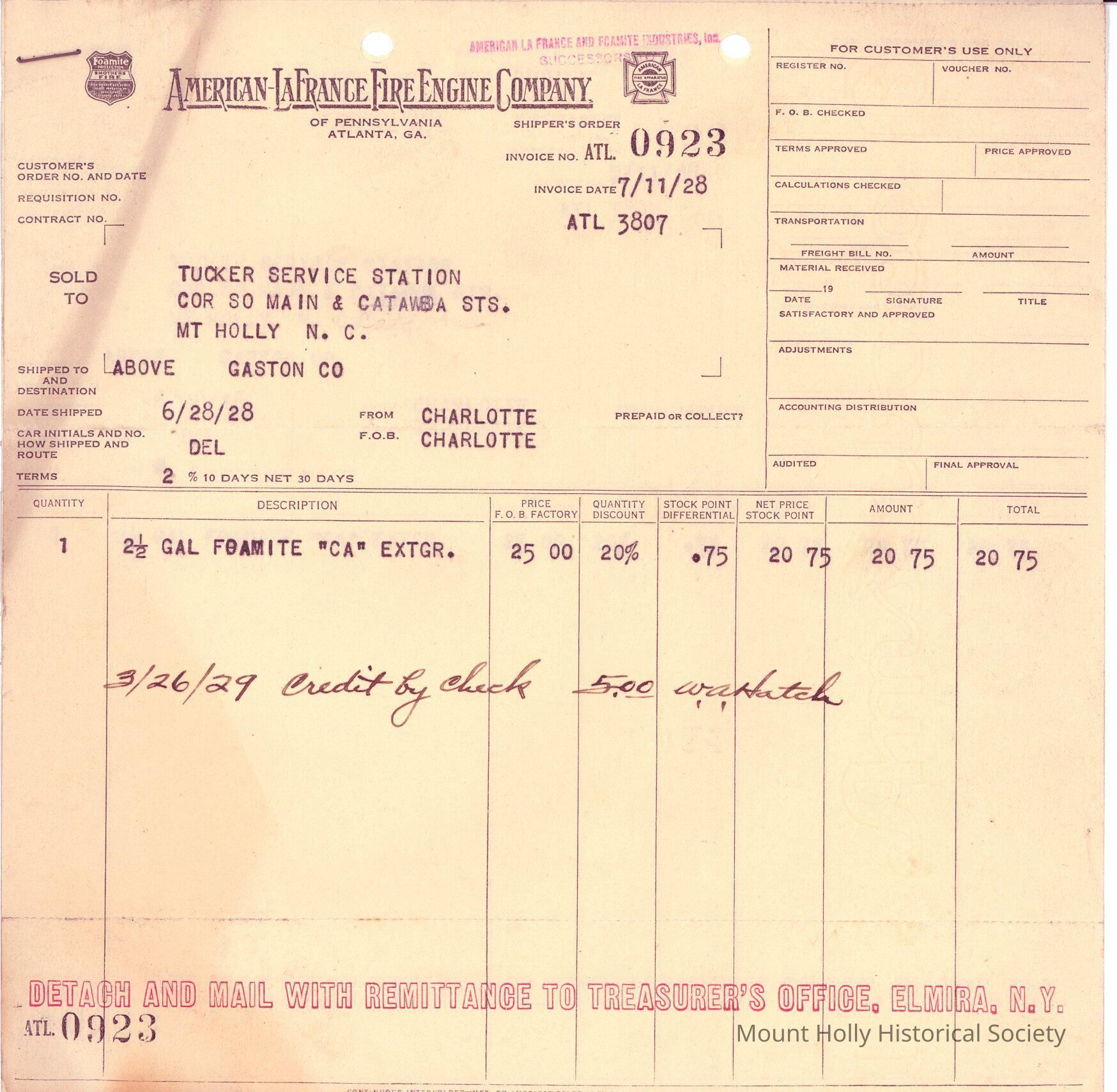 Invoice from American-LaFrance Fire Engine Co. of Pennsylvania (Atlanta branch) to Tucker Service Station for 2 1/2 gallons of foamite (top copy scanned)