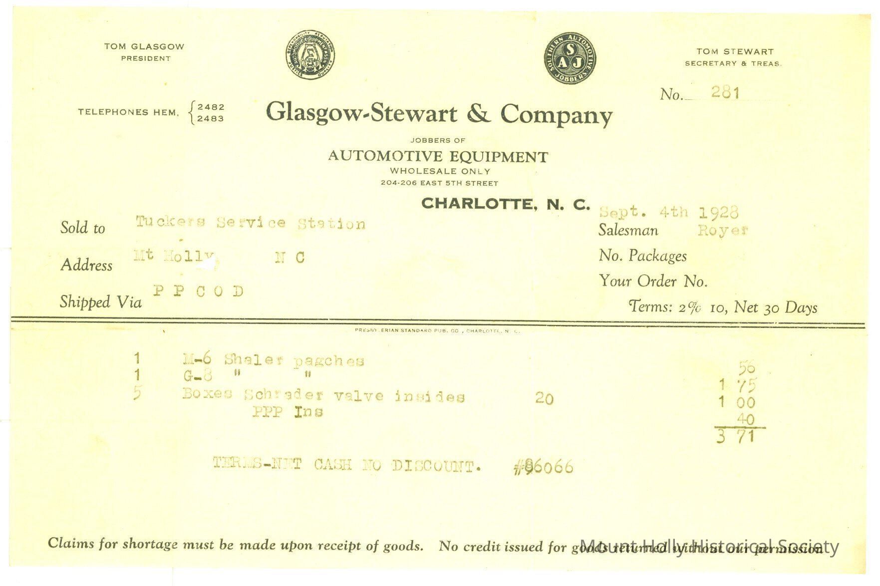 Four invoices (only one scanned) from Glasgow-Stewart Co. in Charlotte to Tucker Service Station for various parts