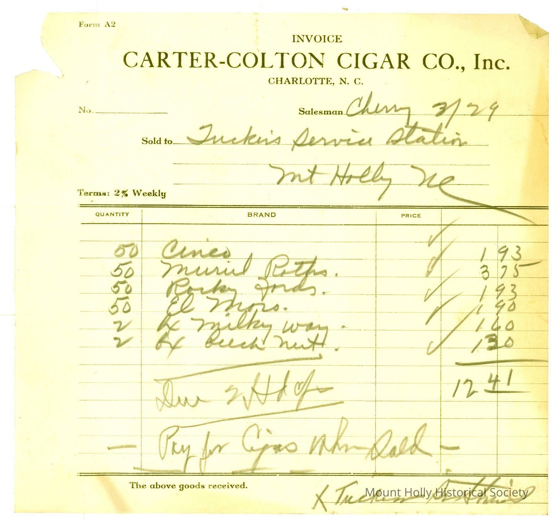 Two invoices (one scanned) from Carter-Colton Cigar Co. in Charlotte to Tucker Service Station for tobacco products