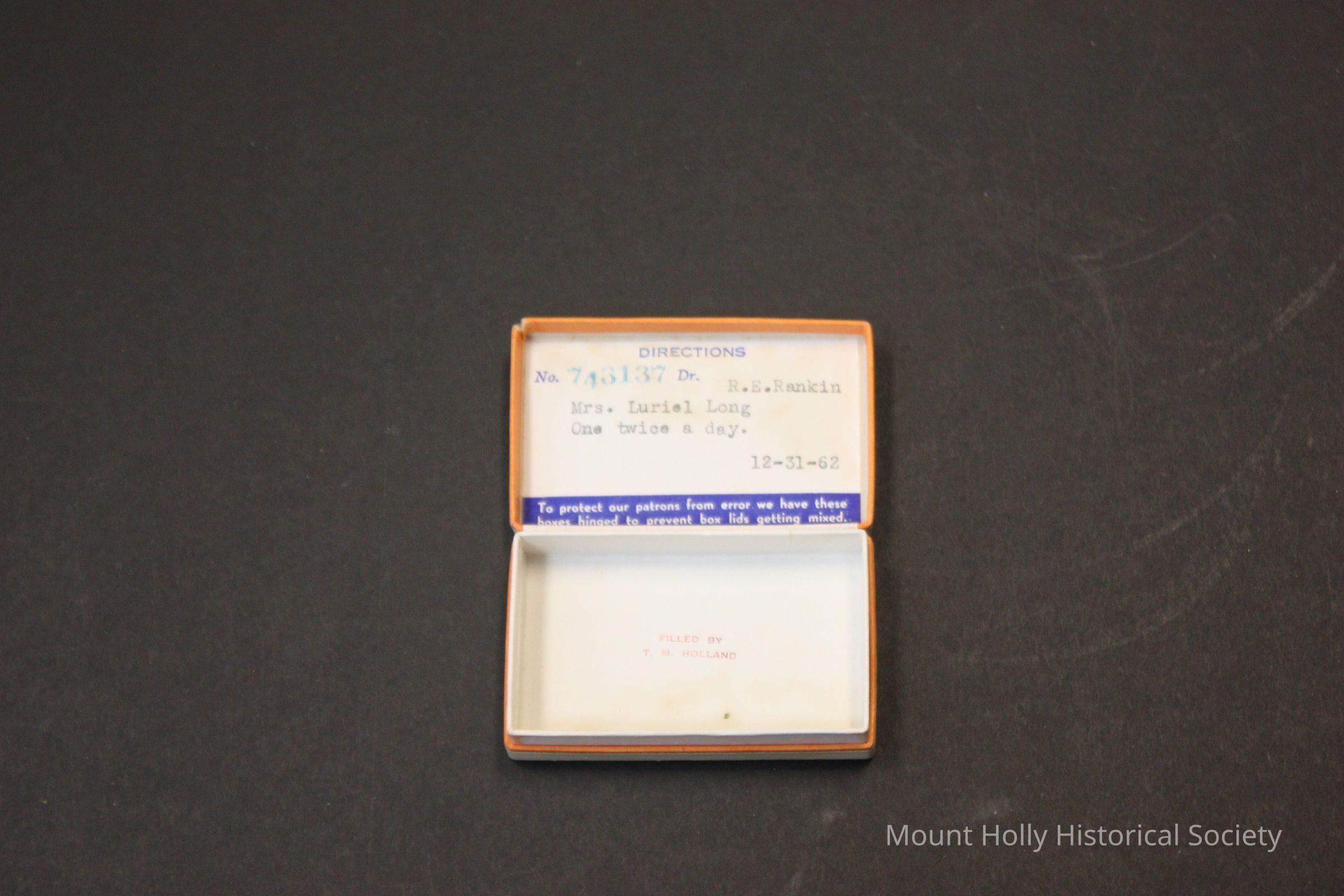 Cardboard pill container with Holland Drug Company label Inside - prescribed for Mrs. Luriel Long by Dr. R. E. Rankin Filled by T. M. Holland