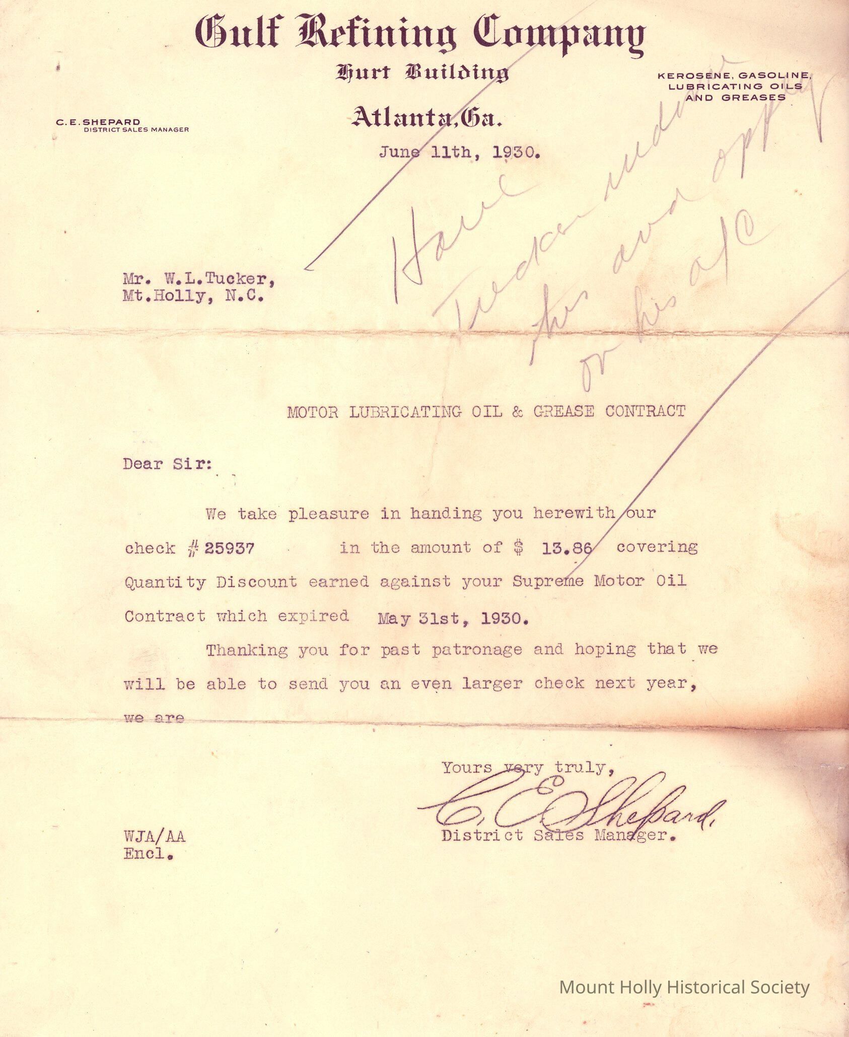 Letter from Gulf Refining Co. to W.L. Tucker enclosing a check to him for a discount he had earned (check not included; handwritten note on letter)