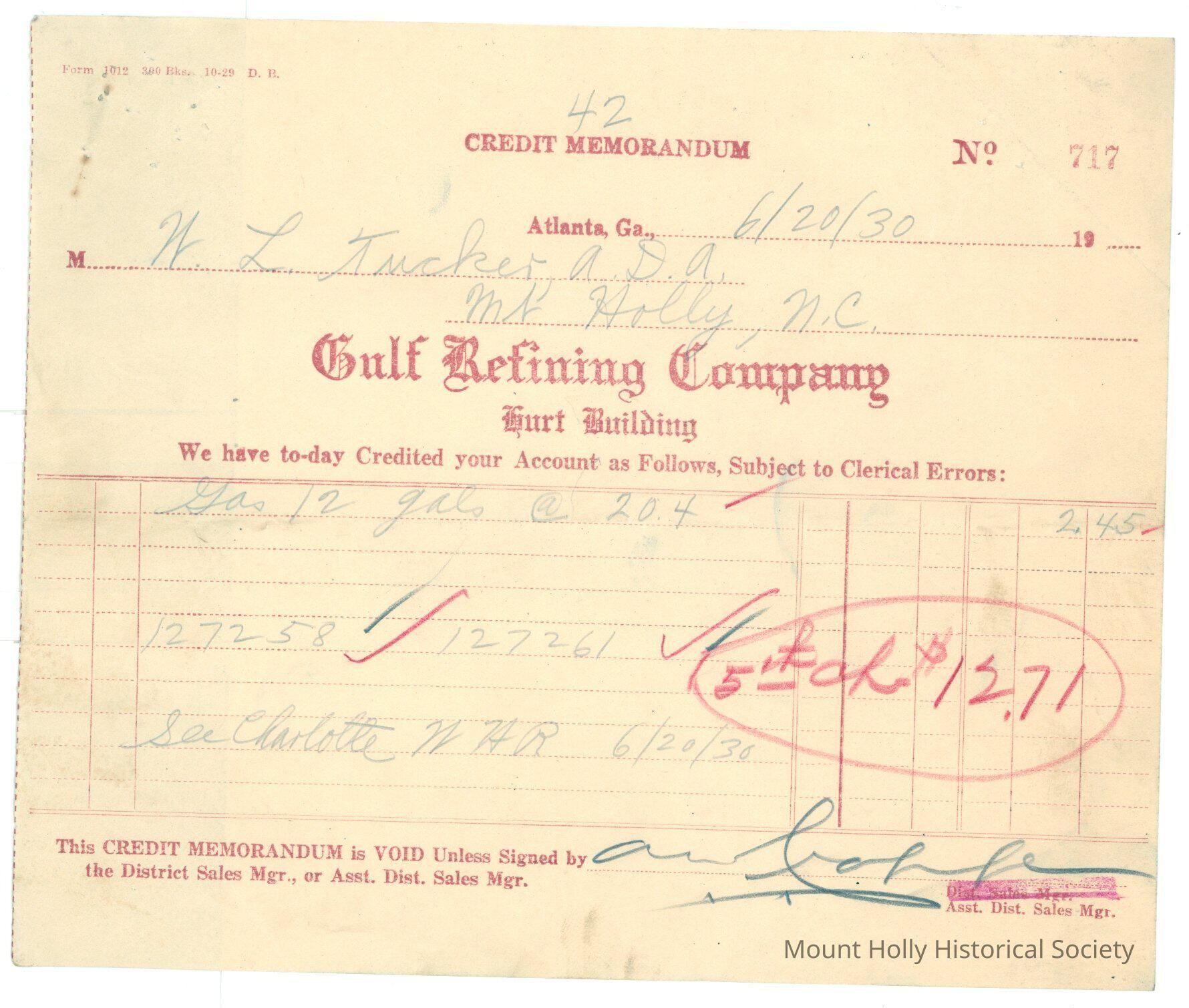 Six sets of credit memos (only one scanned) from Gulf Refining Co. to W.L. Tucker for deliveries with accompanying letters of explanation (latter not scanned)