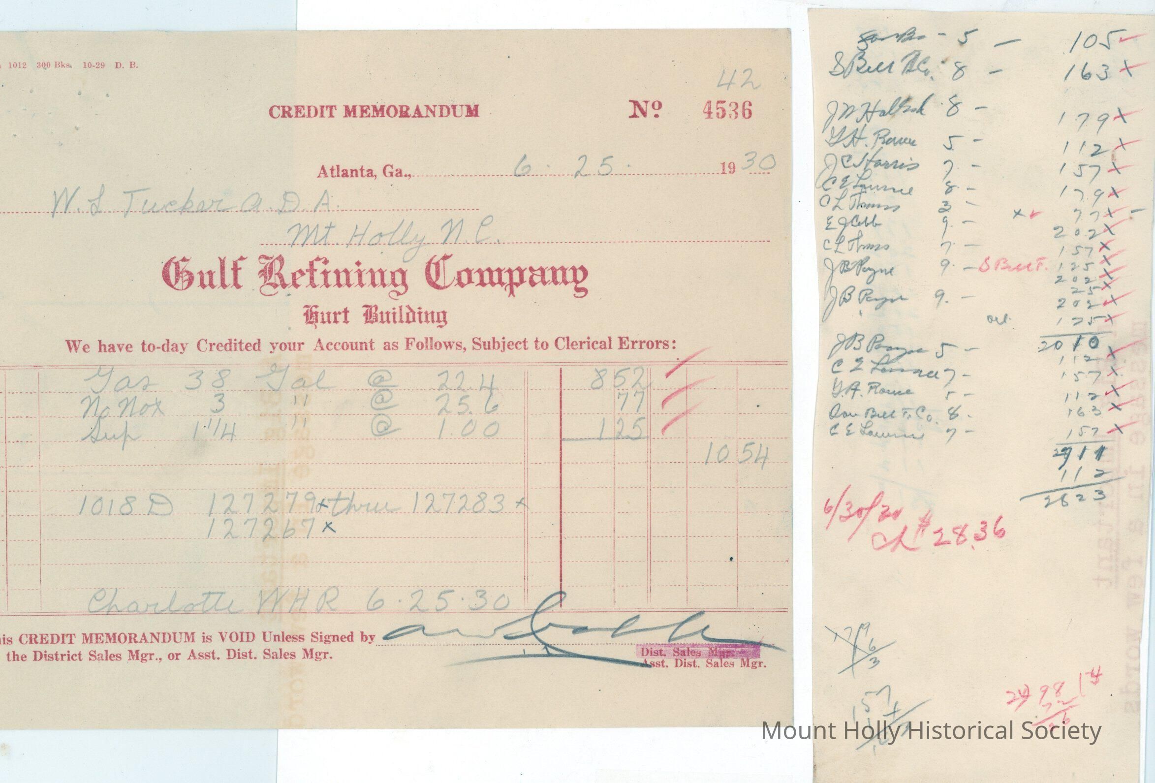 Two sets of credit memos from Gulf Refining Co. to W.L. Tucker for deliveries (only the first memo, and handwritten list attached thereto, scanned)