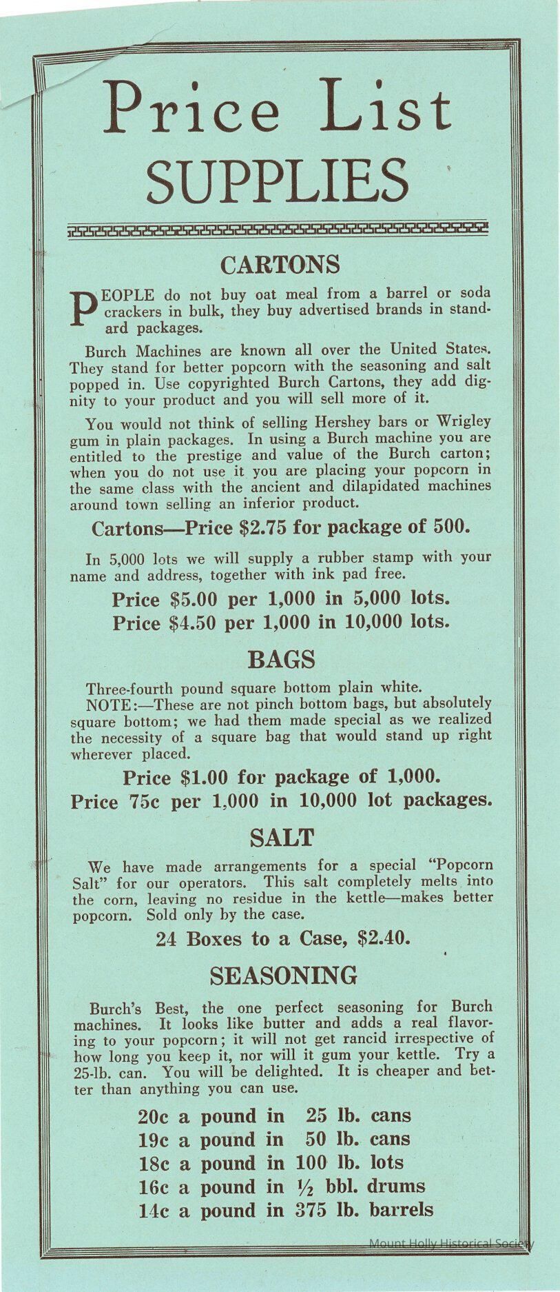 Advertisement and price list for cartons, bags, salt, seasoning, corn, and toys sold by Burch Manufacturing Co. in Kansas City (MO)