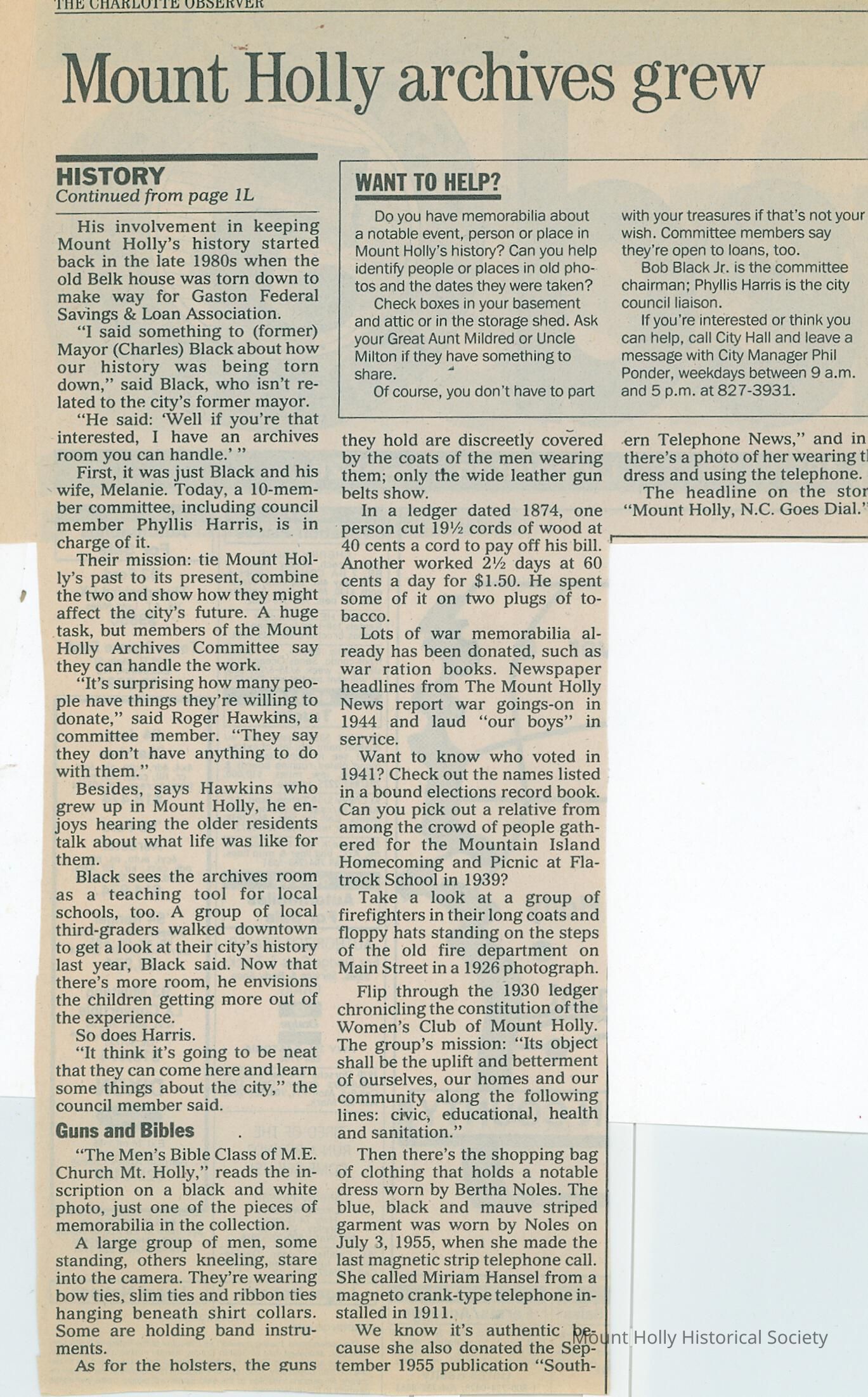 News article from Charlotte Observer "Mount Holly Archives Grow"