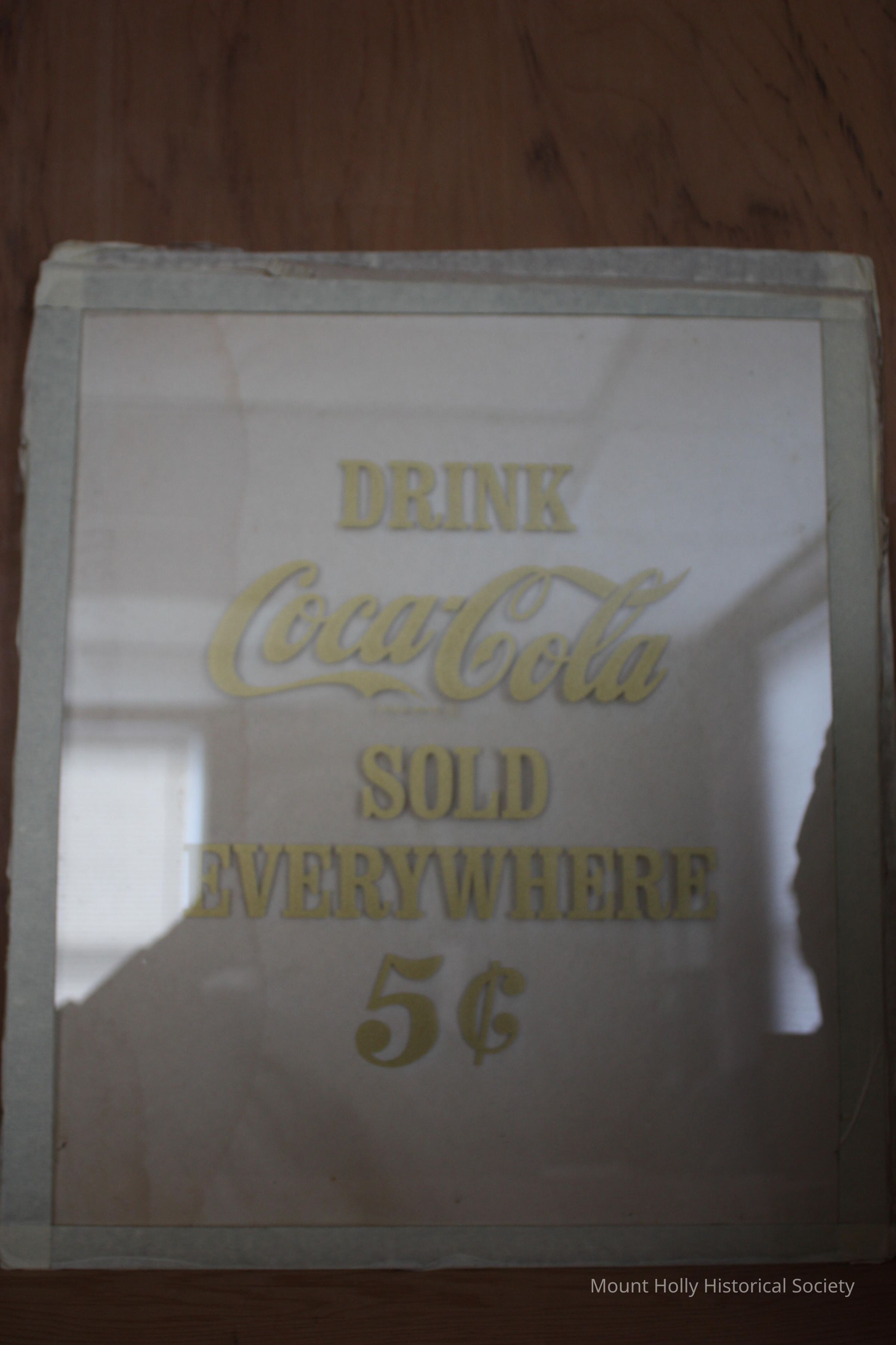 Clear glass panel 16" x 24" with gold lettering "Drink Coca-Cola Sold Everywhere 5[cents]"