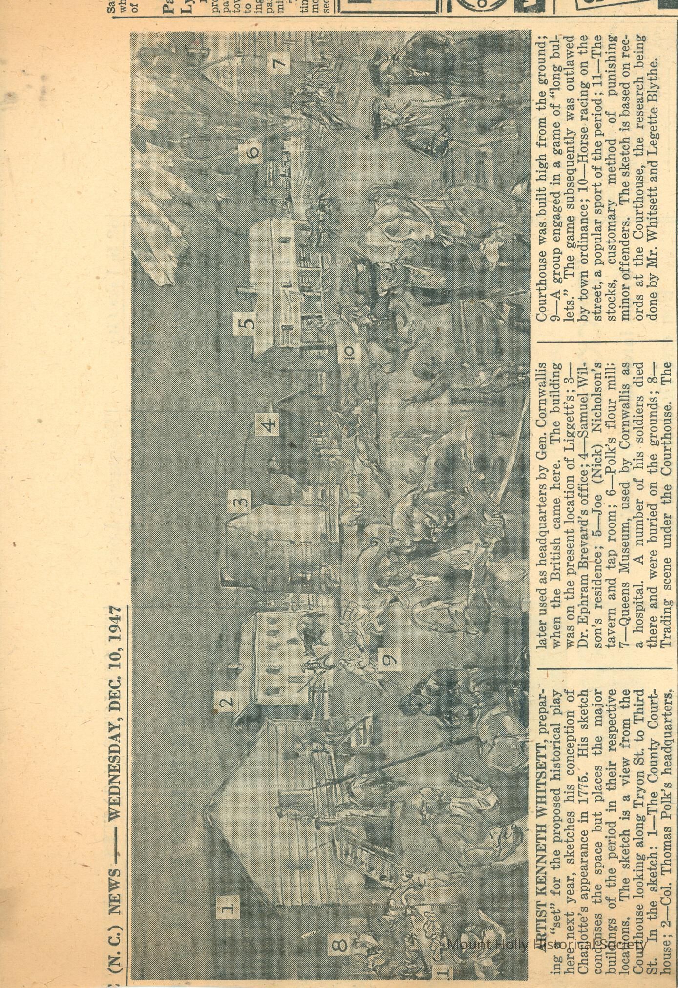 Article displaying Kenneth Whitsett's sketches of 1775 Charlotte for historical play.