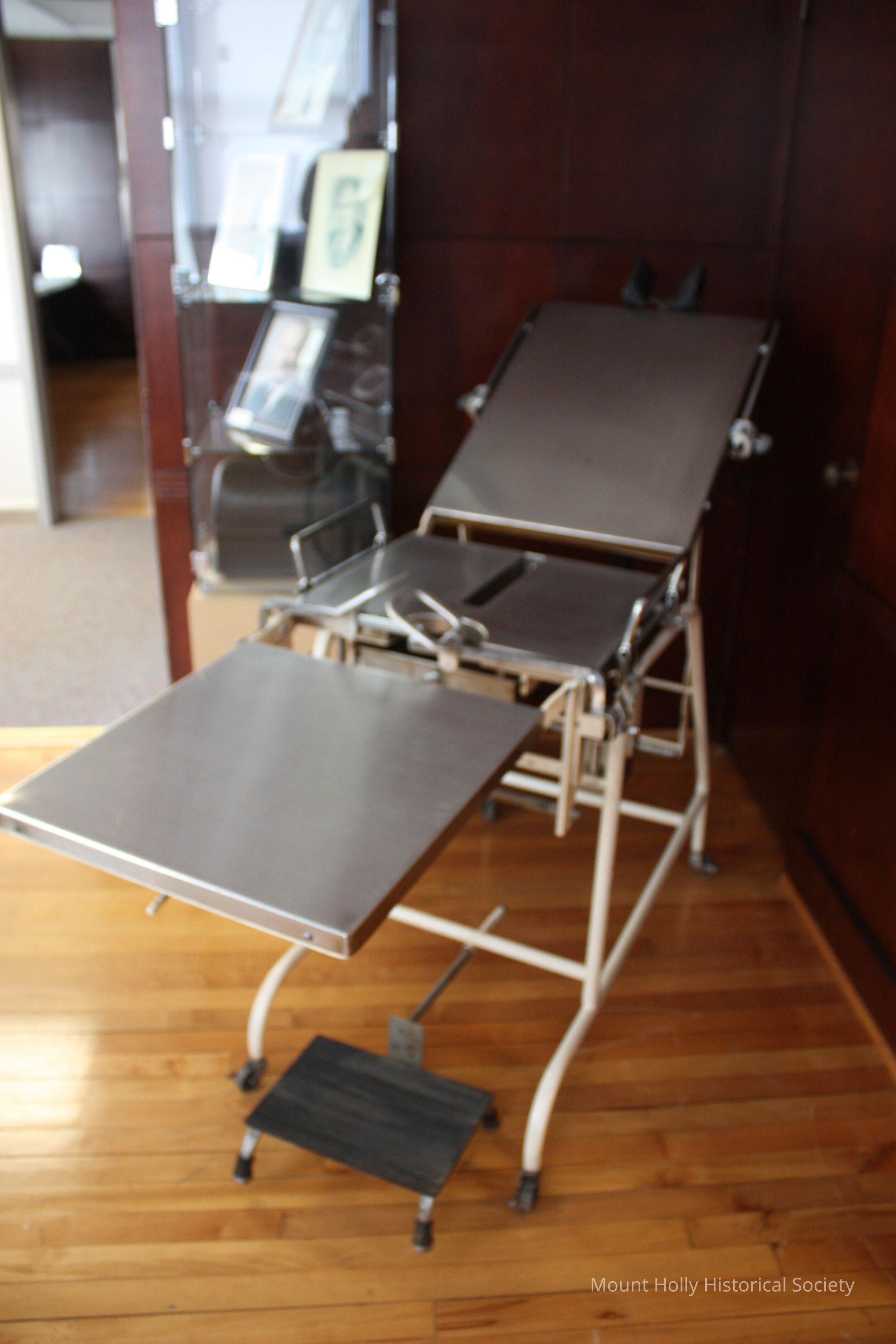 Steel Examining table with headrest, footrest, and stirrups, with wheels