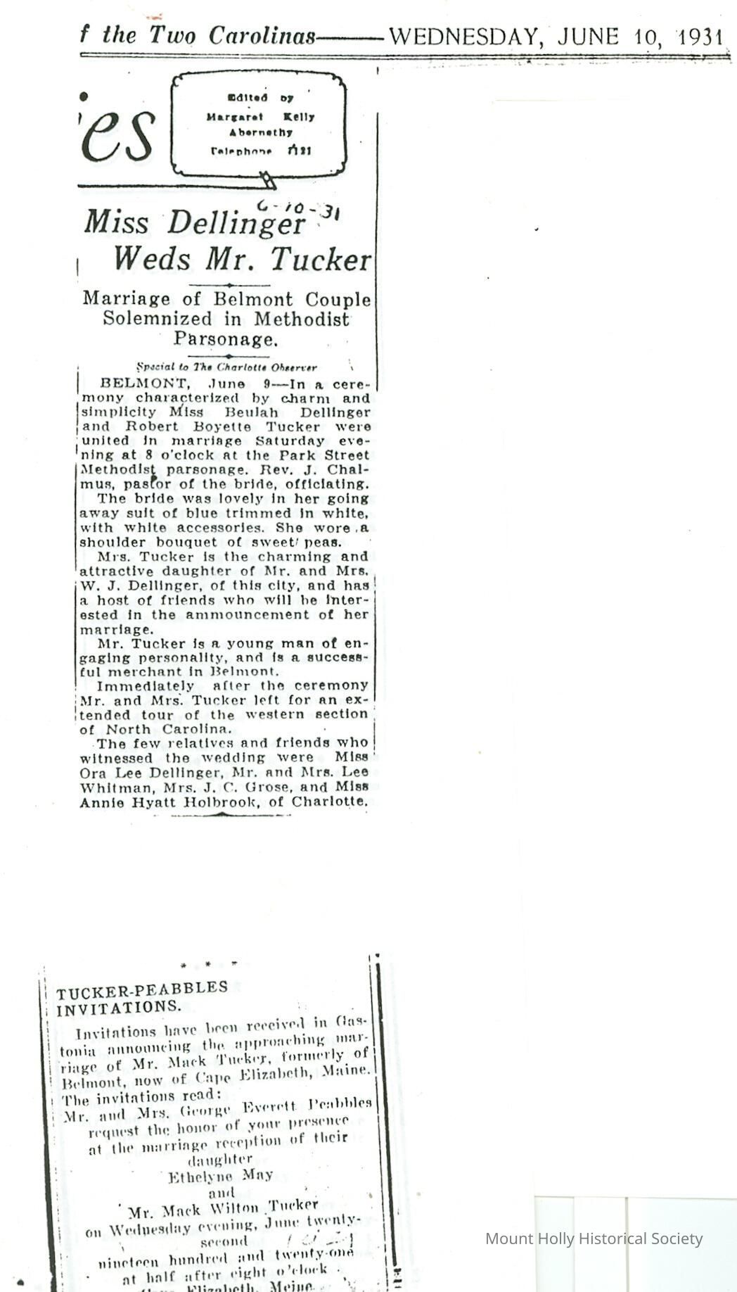 Wedding of Beulah Dellinger & Rob Tucker. Wedding announcement Mack Tucker and Ethelyne May