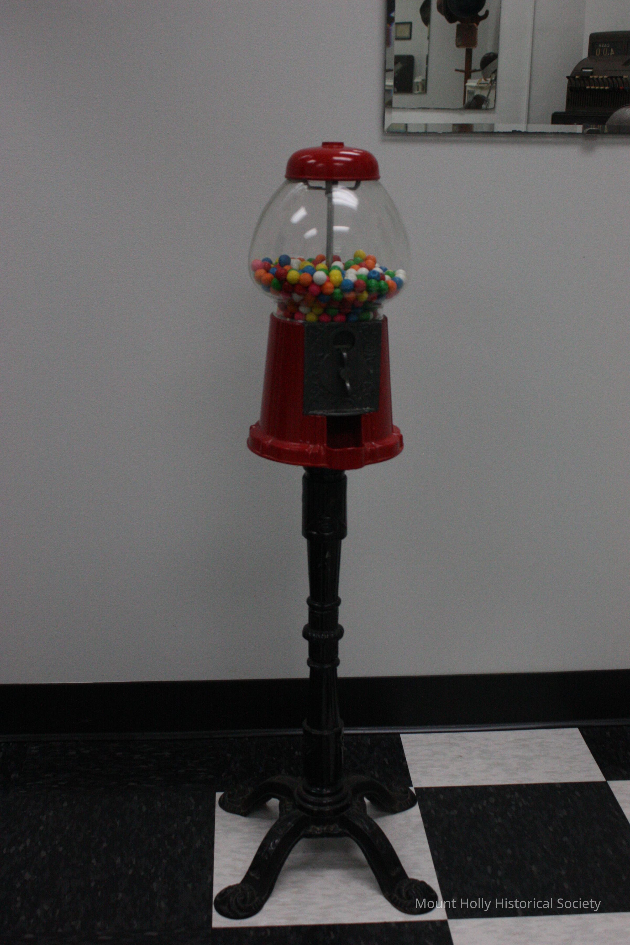 3 feet tall, glass globe, dispenses gumballs Black metal stand and red metal top Manufactured in Taiwan