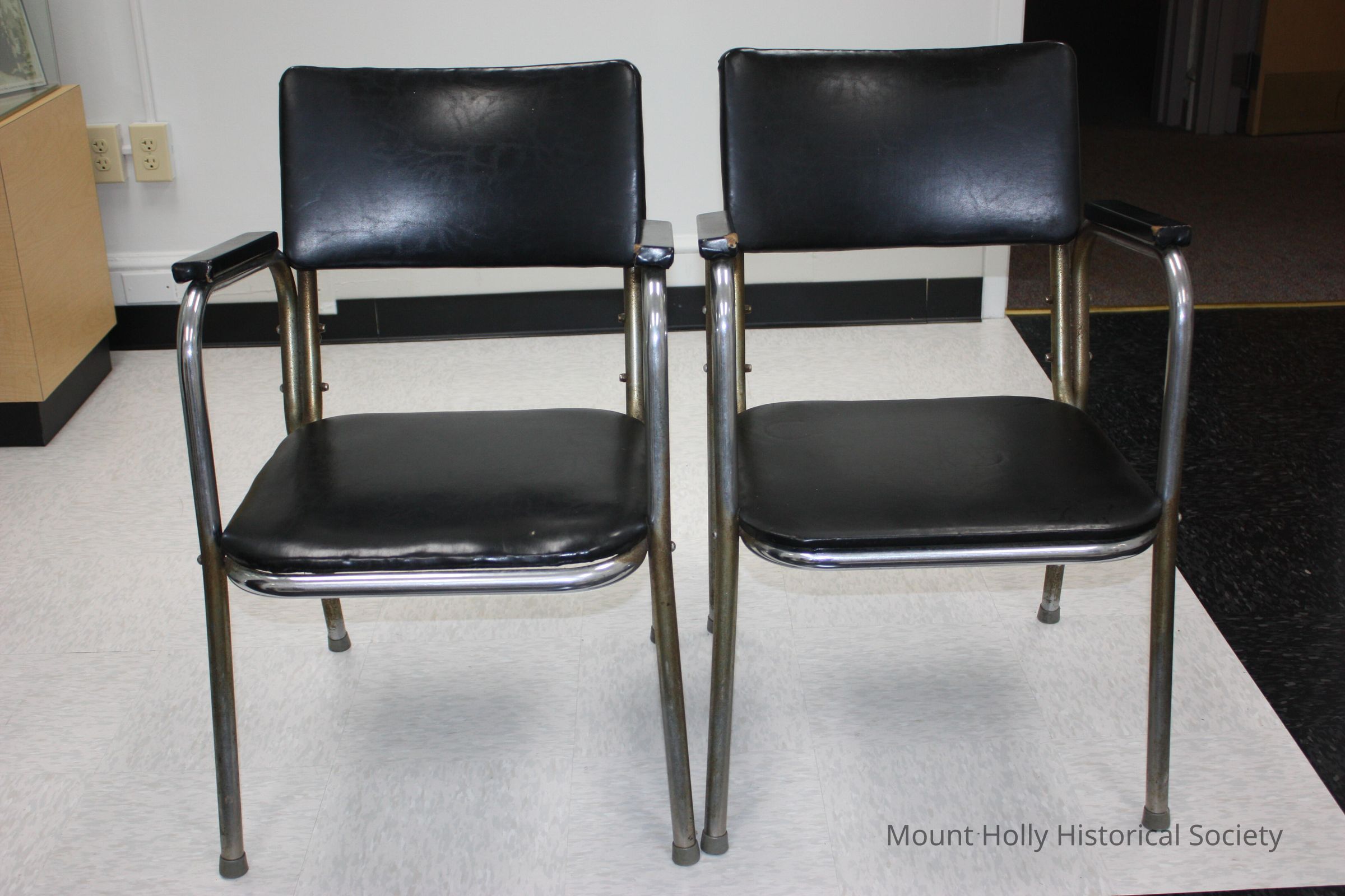 Two vinyl upholstered metal chairs, used by customers waiting for haircuts