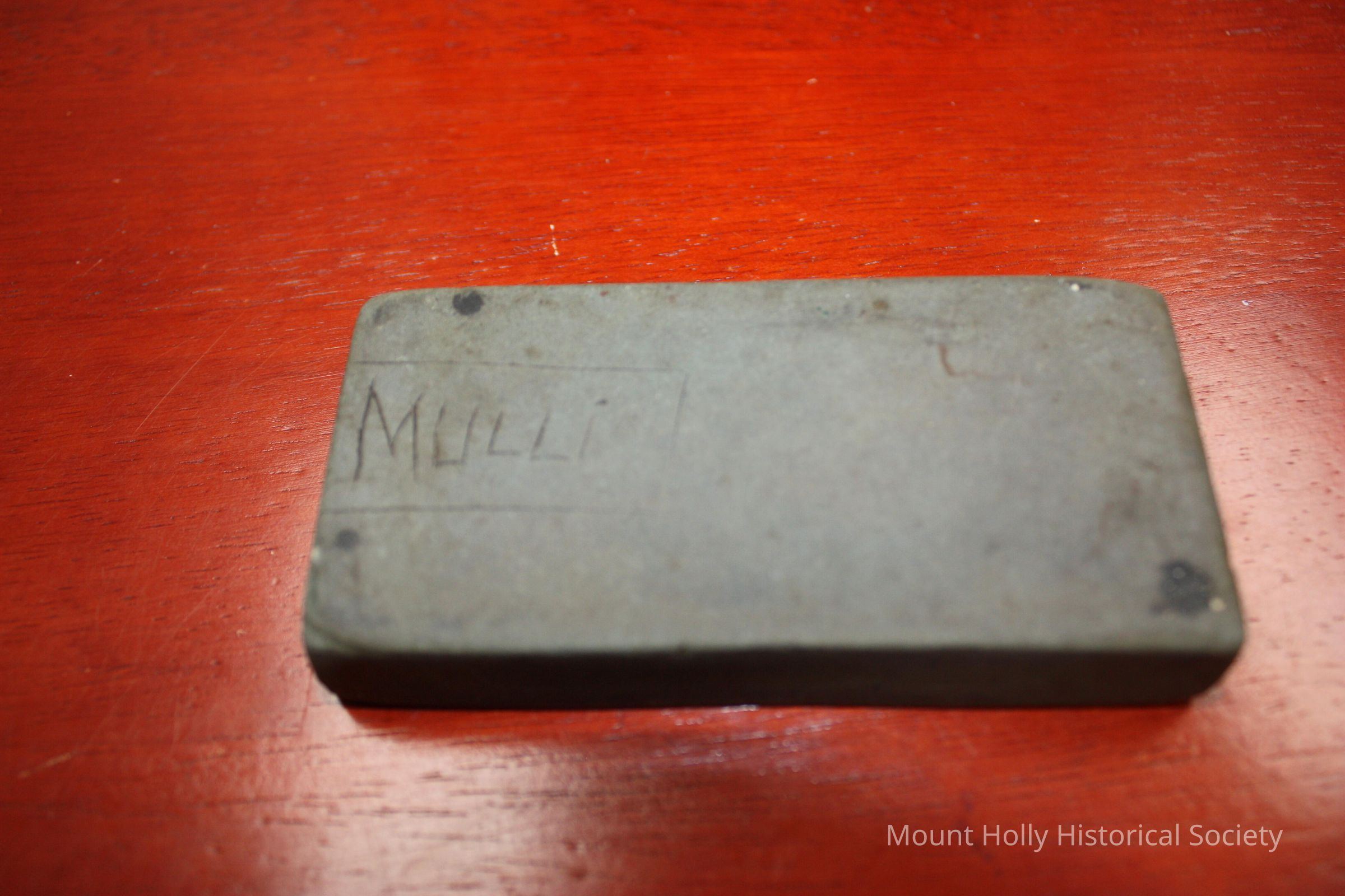 4 inches by 2 inches by 1/2 inches Green "Mullis" carved into stone