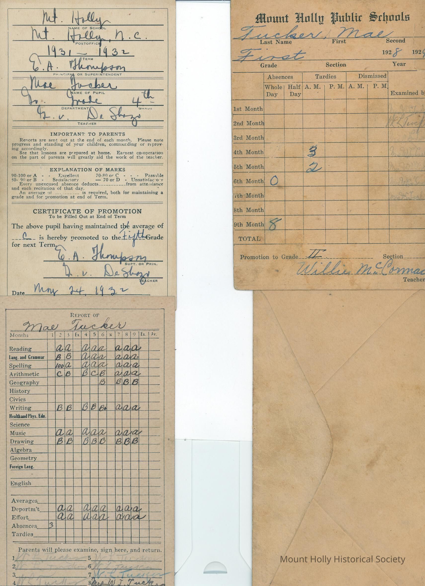 Three report cards and one envelope for Mae Tucker for first, third, and fourth grades (front and back scanned)