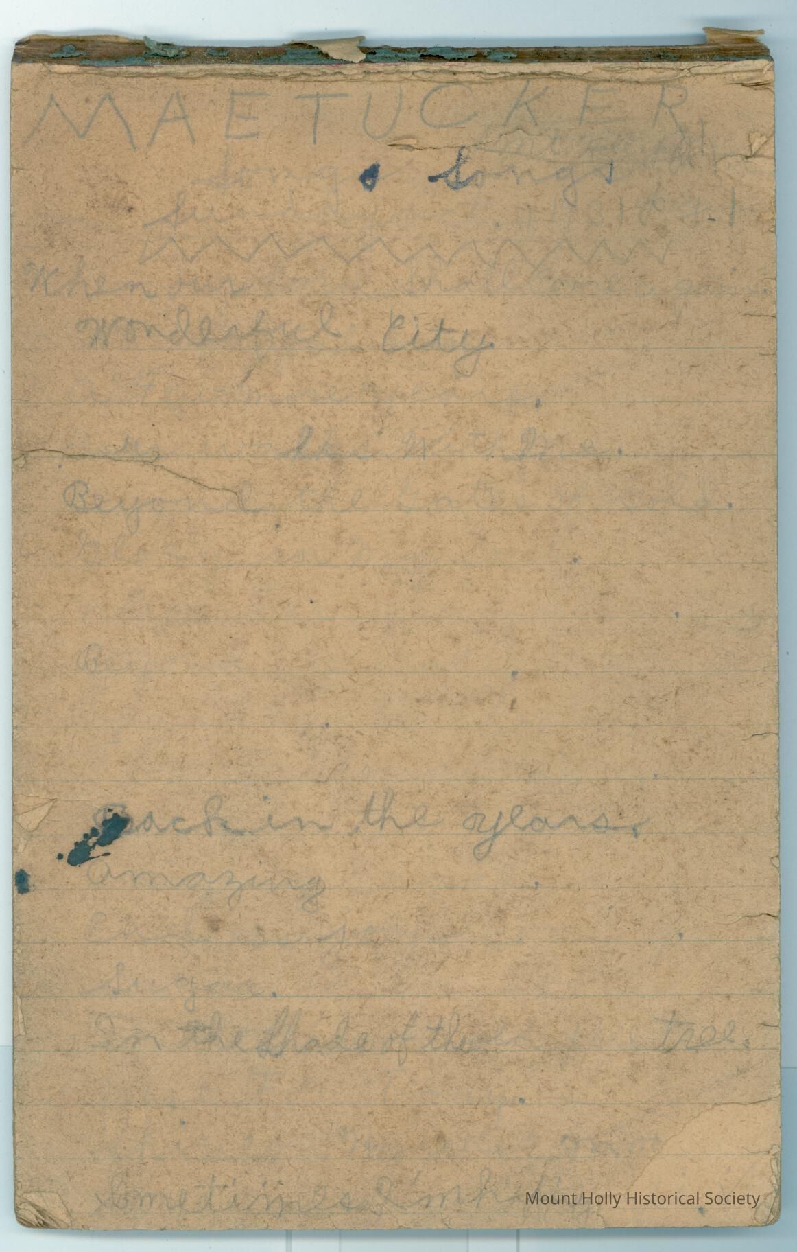 Mae Tucker's paper notepad, containing lists of song and hymn titles (only front page scanned)